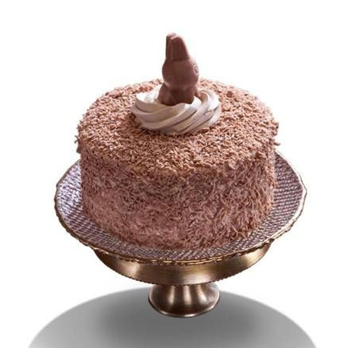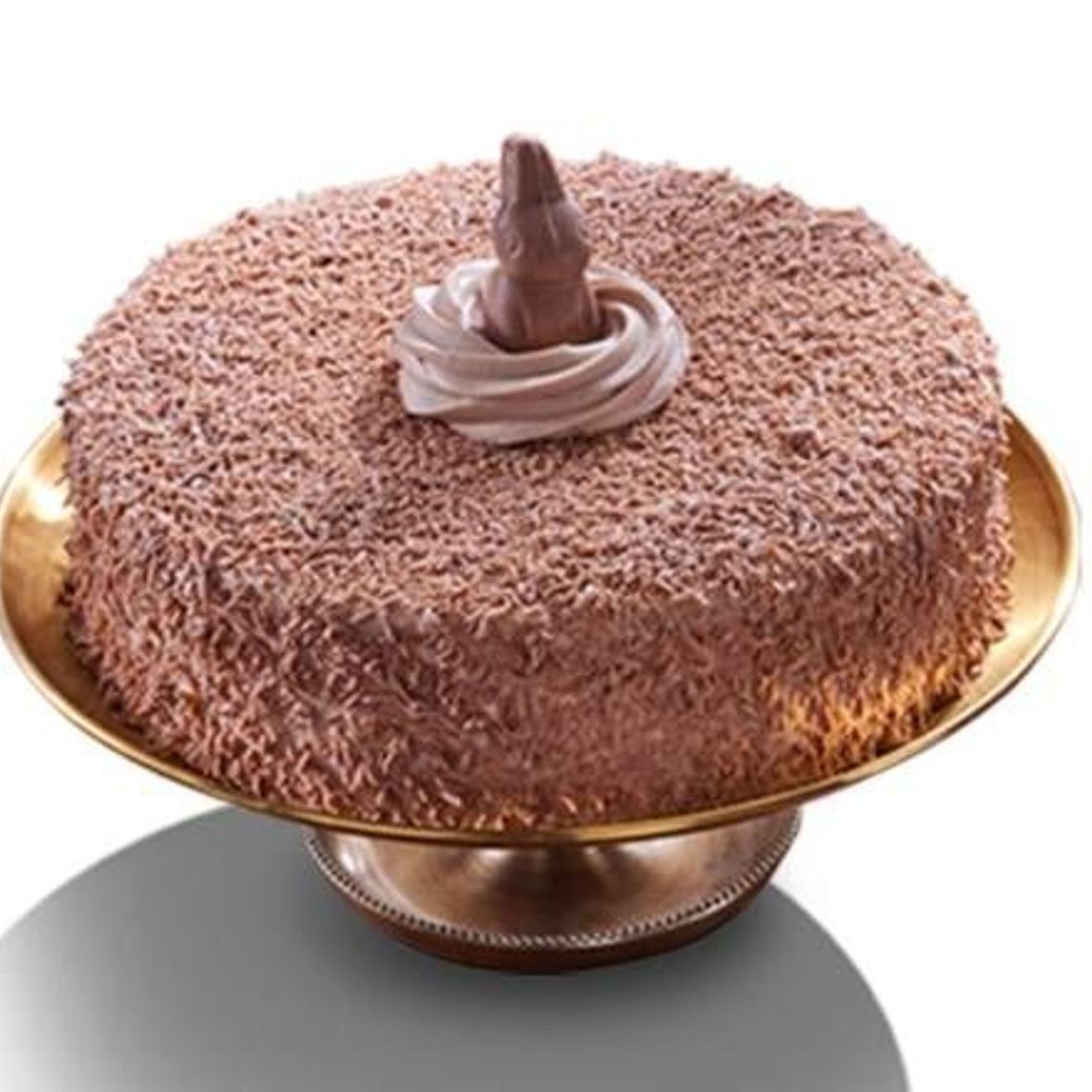Delicioso pastel con auténtico conejito Turín, hecho con un suave bizcocho de vainilla, cubierto por una crema de ganache de chocolate de leche y viruta de chocolate de leche