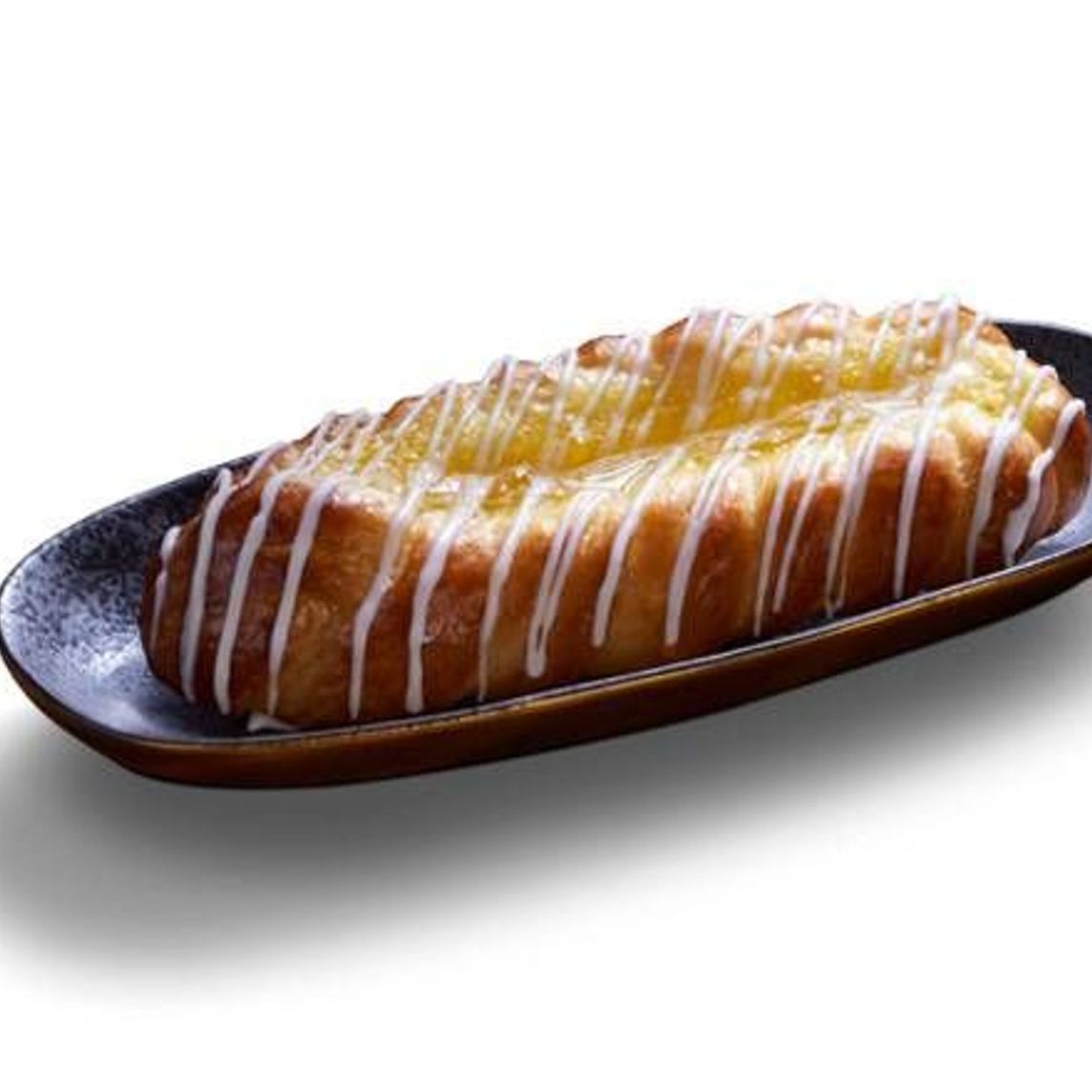 Delicioso pan elaborado de masa danesa, de textura suave decorado con un delicioso relleno de piña y líneas de cobertura blanca