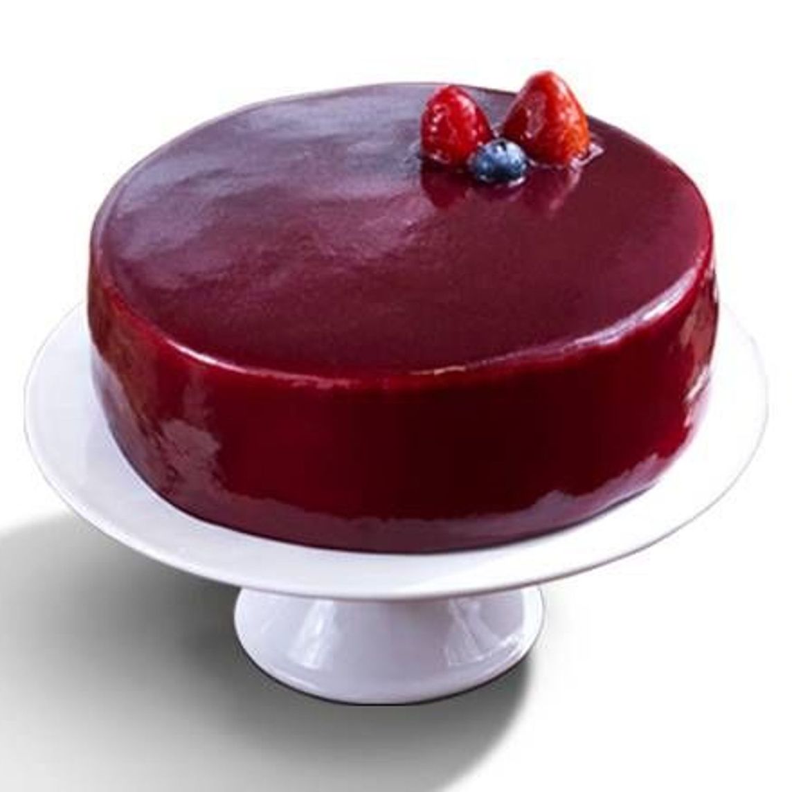 Pastel frutal a base de suave bizcocho de vainilla, relleno de mermelada de frutos rojos y crema montada de yogurt de fresa, cubierto con glaseado de frutos rojos y frutas frescas.