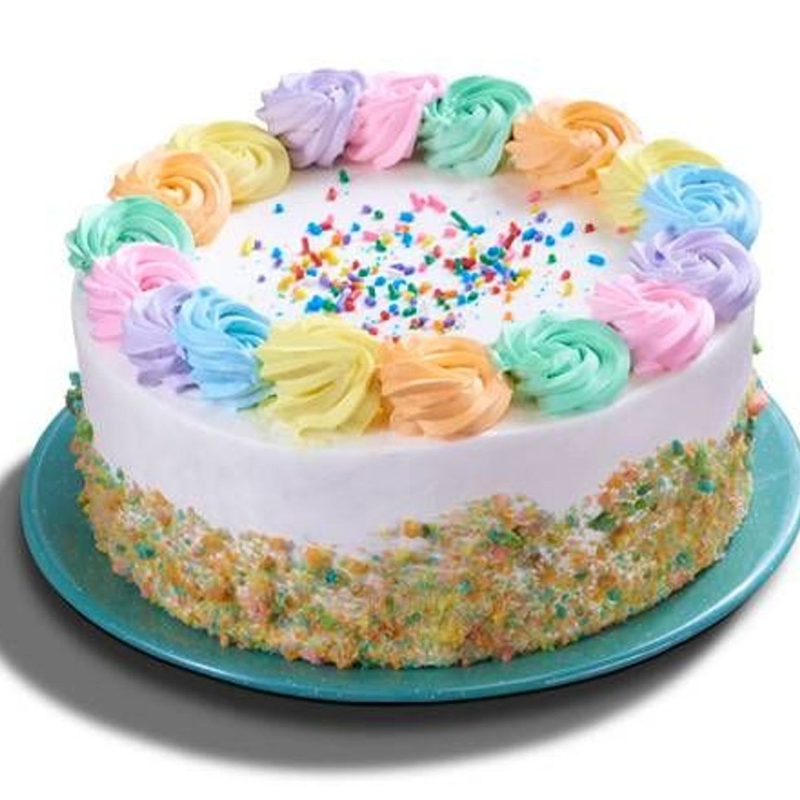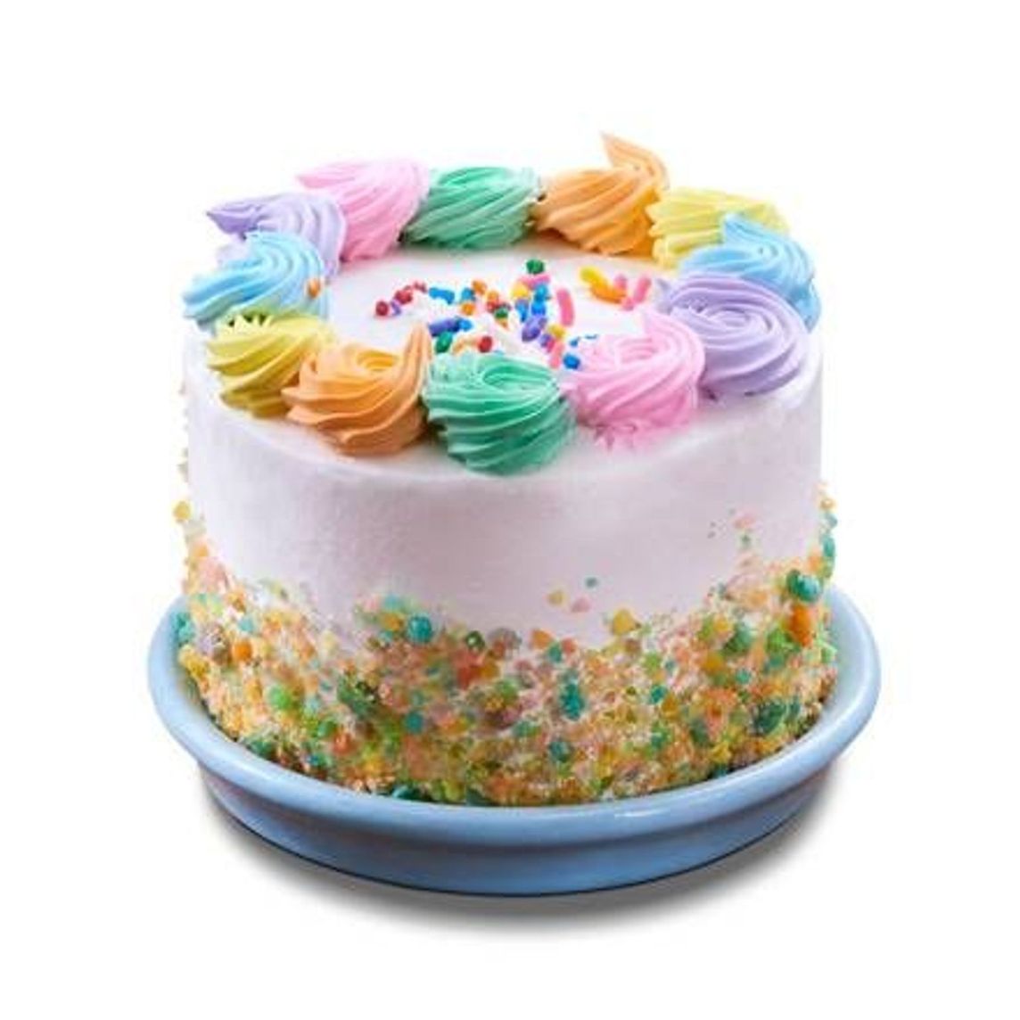 Divertido pastel individual, elaborado con bizcocho de vainilla de 6 diferentes colores, recubierto con crema chantilly y decorado con rosetones y gragea de colores en tonos pastel.