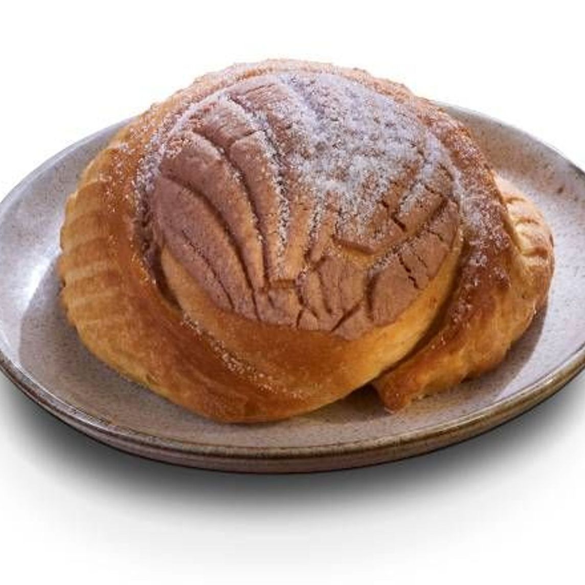 Deliciosa masa de bizcocho que envuelve un relleno de piña, cubierto con tapa de concha de chocolate decorada con azúcar.