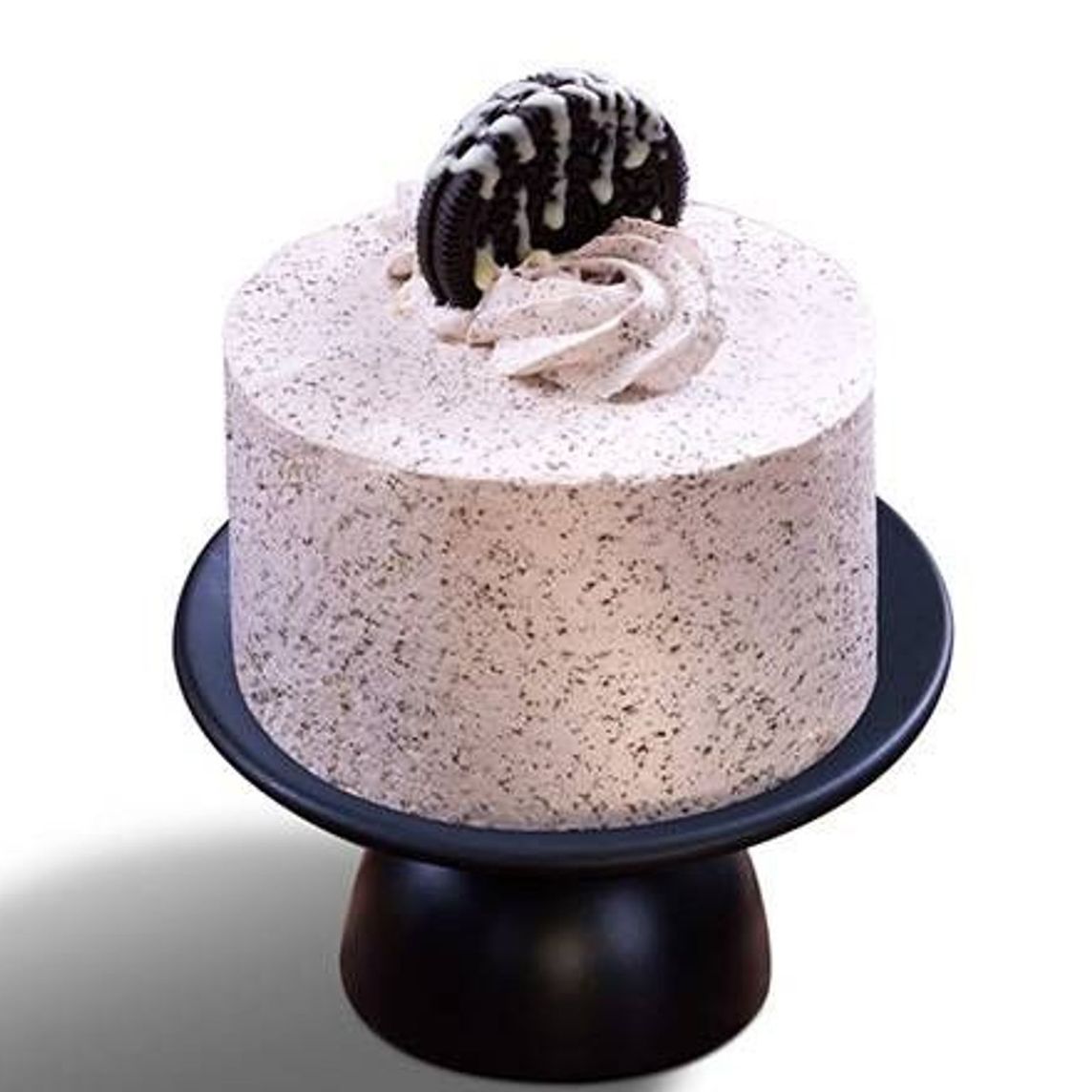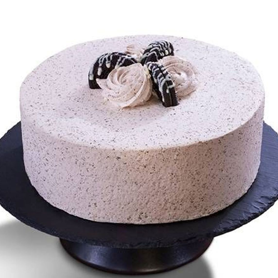Delicioso pastel mitad bizcocho de vainilla y mitad bizcocho de chocolate, relleno de un cremoso centro de queso, cubierto de una exquisita crema de galletas oreo troceadas y decorado con galletas tipo sándwich.