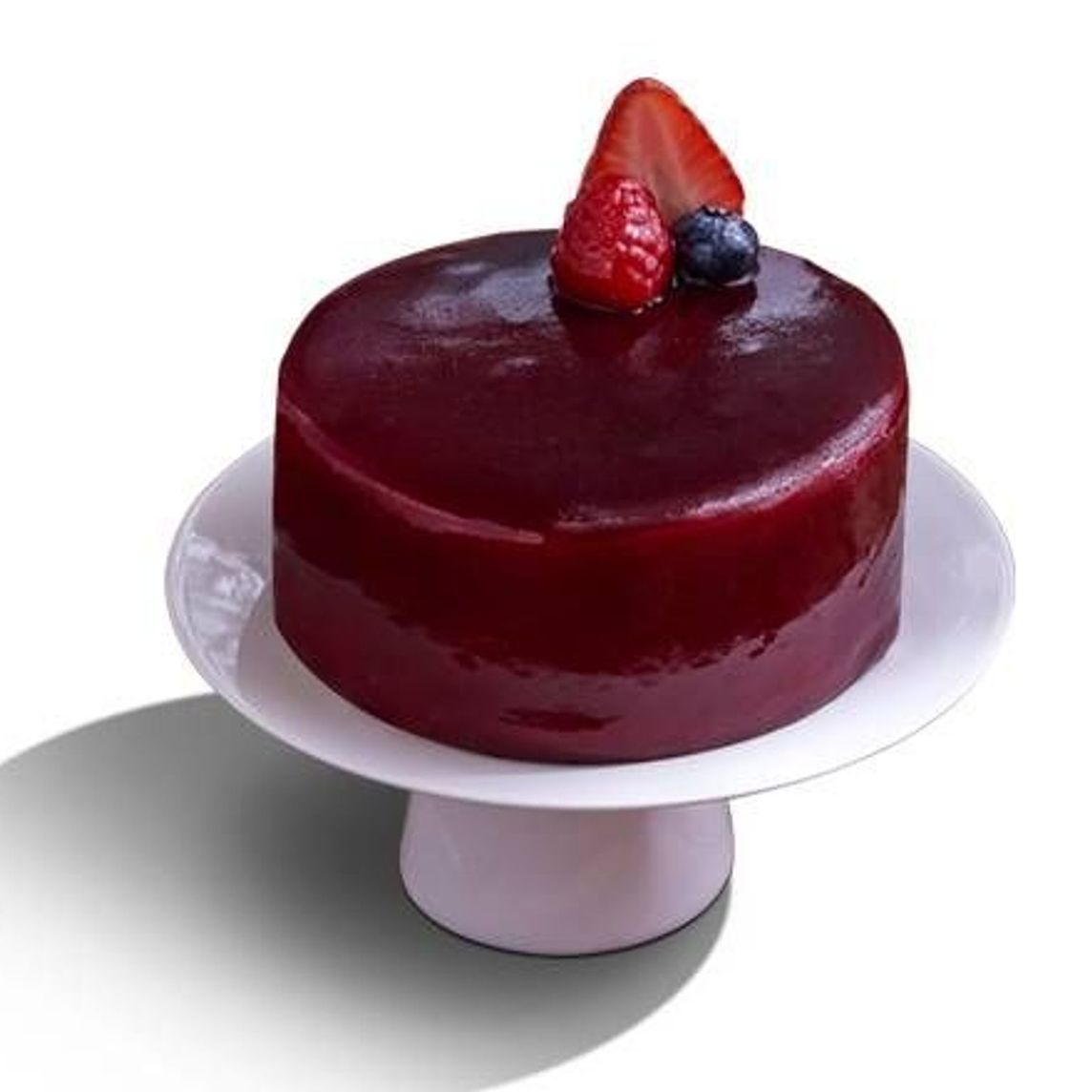 Pastel individual, frutal a base de suave bizcocho de vainilla, relleno de mermelada de frutos rojos y crema montada de yogurt de fresa, cubierto con glaseado de frutos rojos y frutas frescas.
