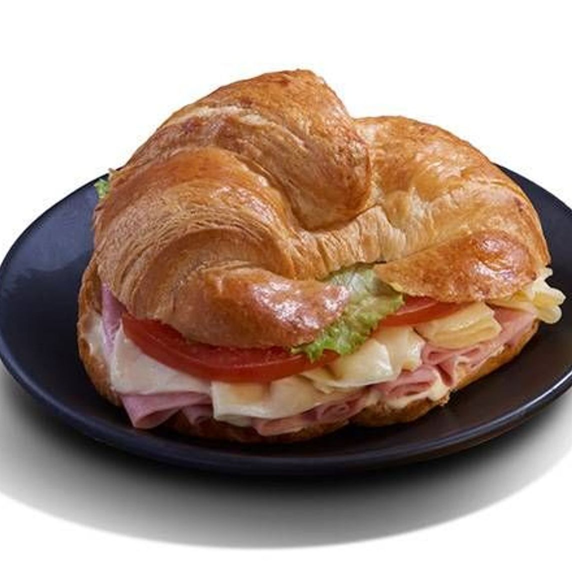 Delicioso y esponjoso cuerno de mantequilla relleno de jamón virginia, queso tipo manchego rebanado, mezcla de vegetales y aderezo picosito de mayo chipotle