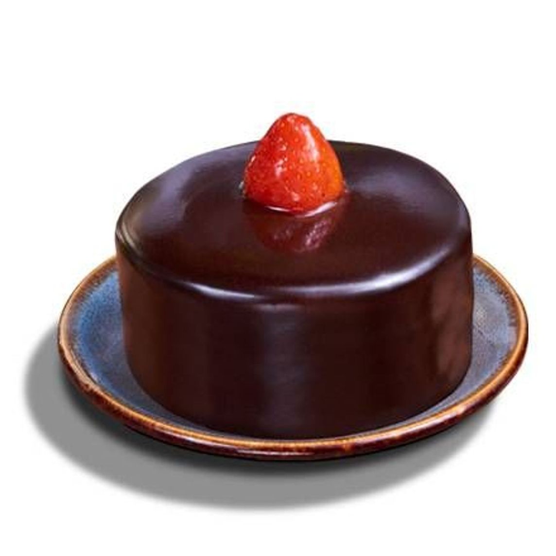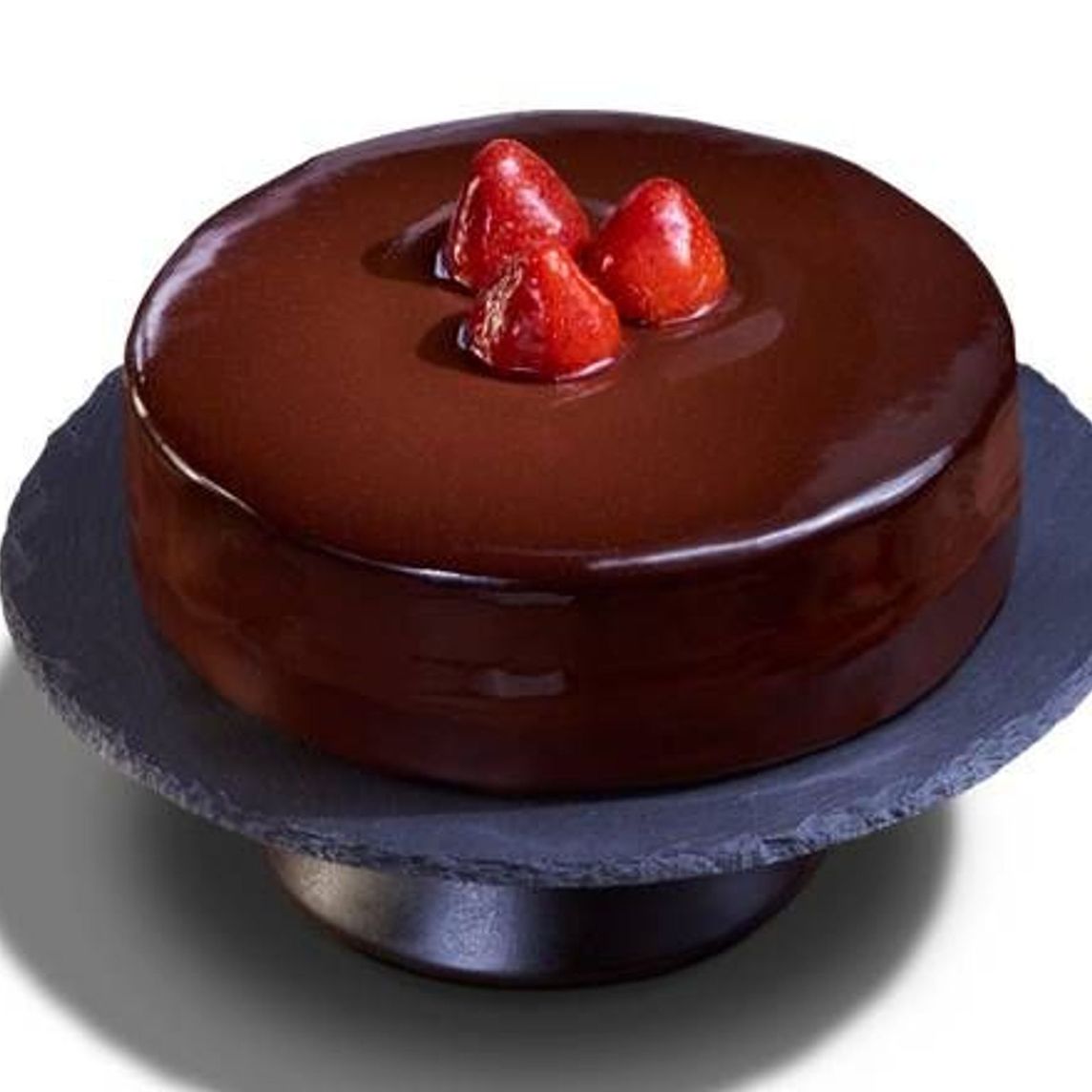 Pastel individual tipo 3 leches de chocolate, elaborado con bizcocho cremoso de chocolate, chispas de chocolate amargo, crema doble chocolate y glaseado brillante de chocolate, decorado con fresas frescas.