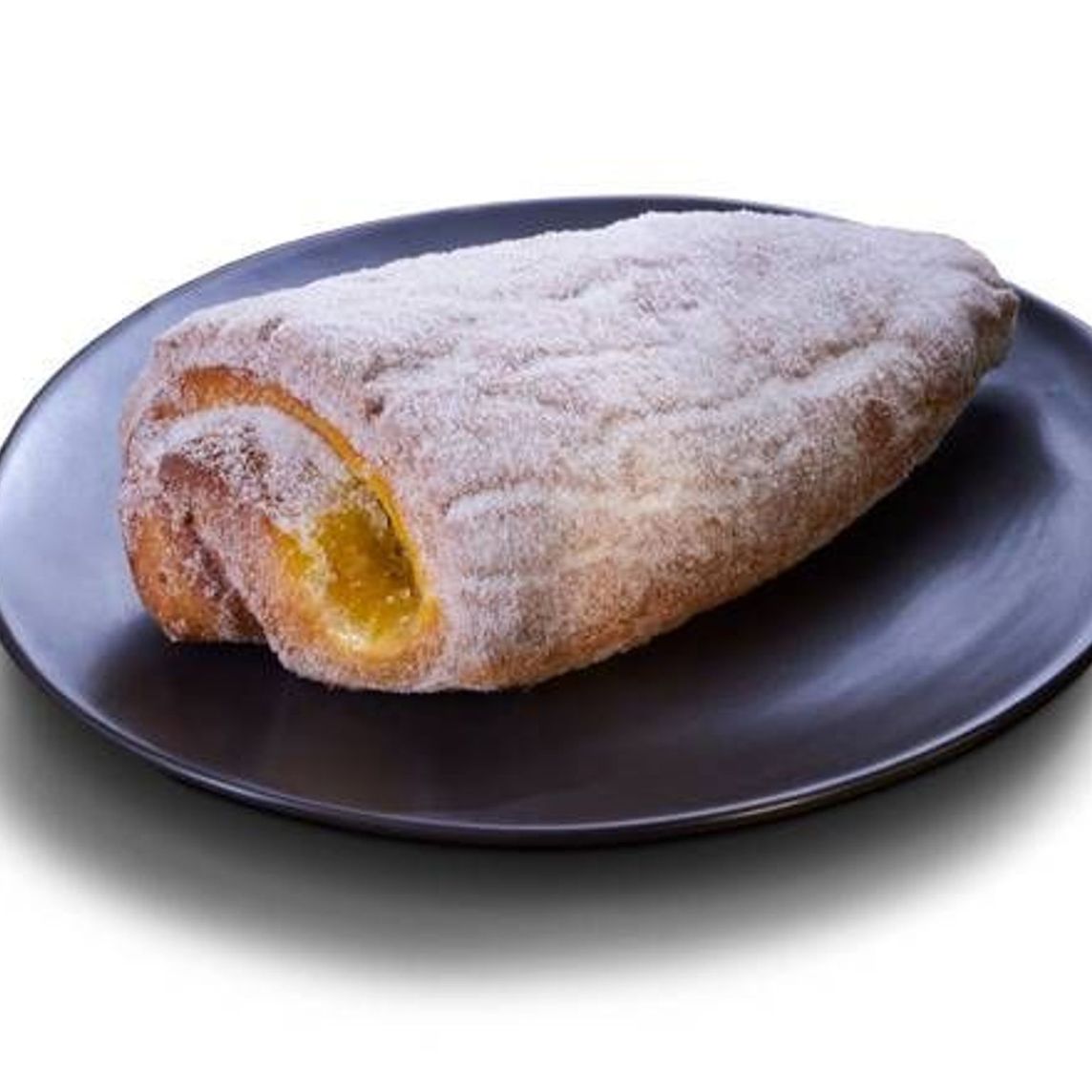 Deliciosa berlinesa clásica rellena de crema pastelera, decorada con azúcar blanca.