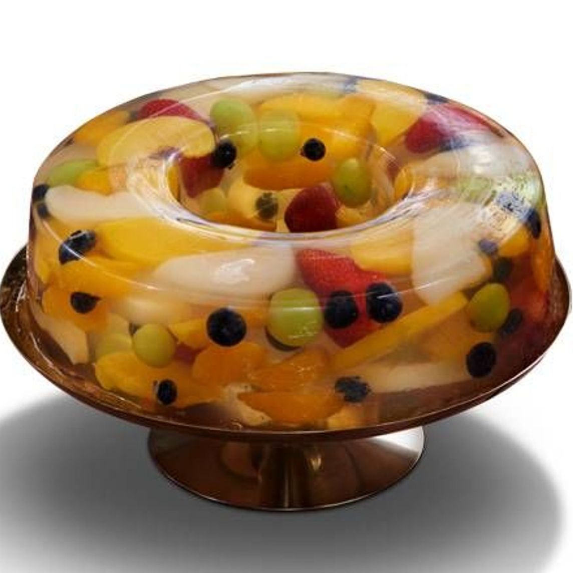 Deliciosa gelatina sabor fresa con diversa fruta encapsulada (durazno, pera, mandarina, uva, fresa y blueberry) en forma de rosca.