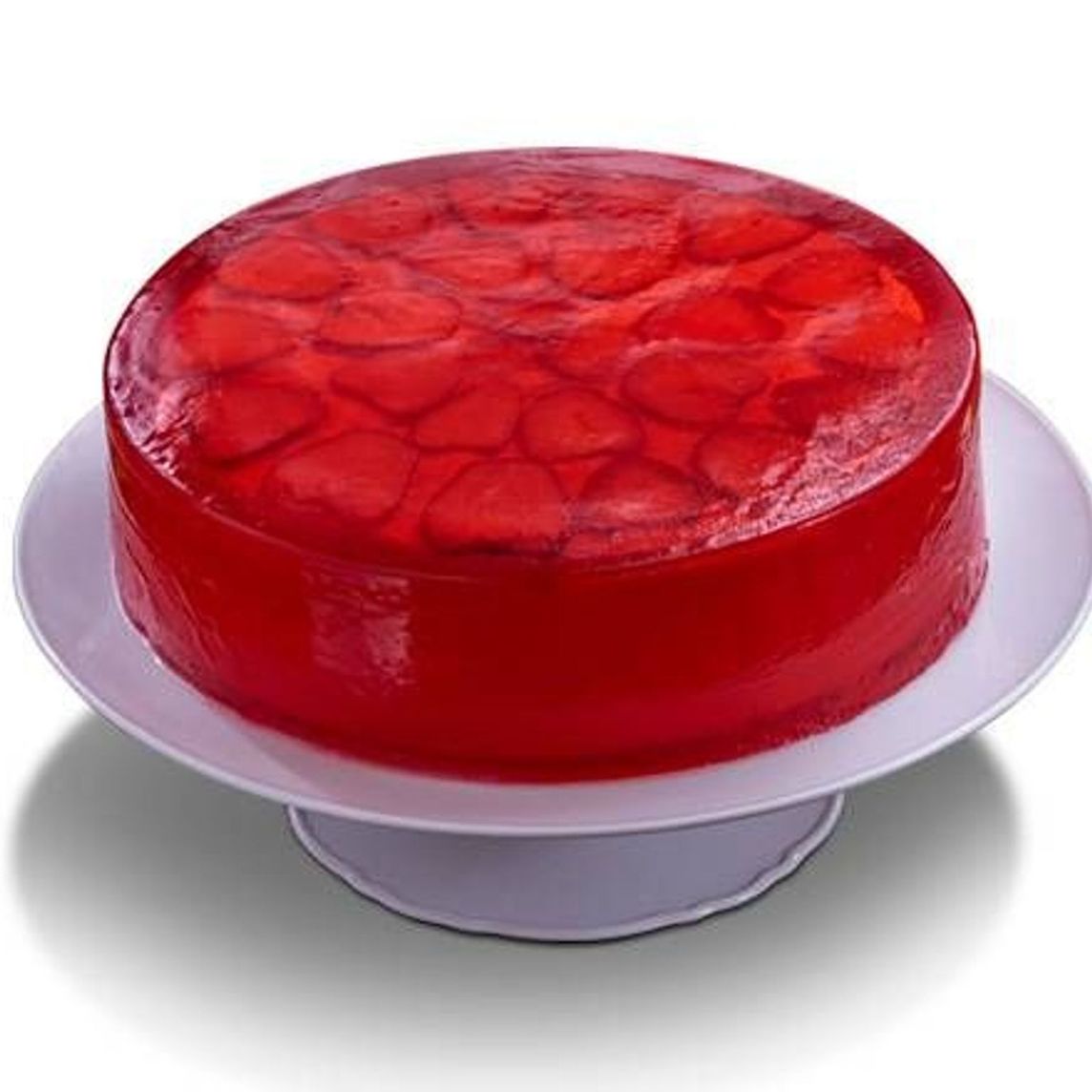 Esponjoso bizcocho de vainilla embebido con jarabe de tres leches y fresas fileteadas, encapsulado en una fresca y deliciosa gelatina de fresa.