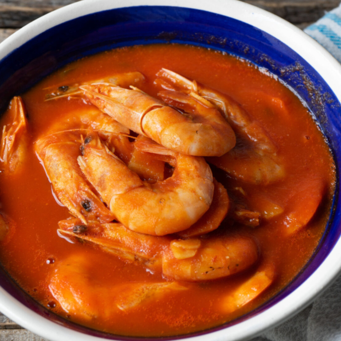 Camaron grande con cascara en caldo de jitomate, epazote y chiles. perfecto para los días fríos o para curar cualquier cruda.