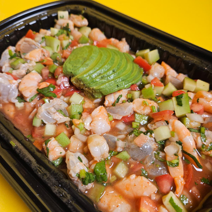 Camarón cocido y camaron crudo curtido en limon, pepino, cebolla, cilantro y aguacate, bañados con la mezcla de la casa y un toque de chiltepin.