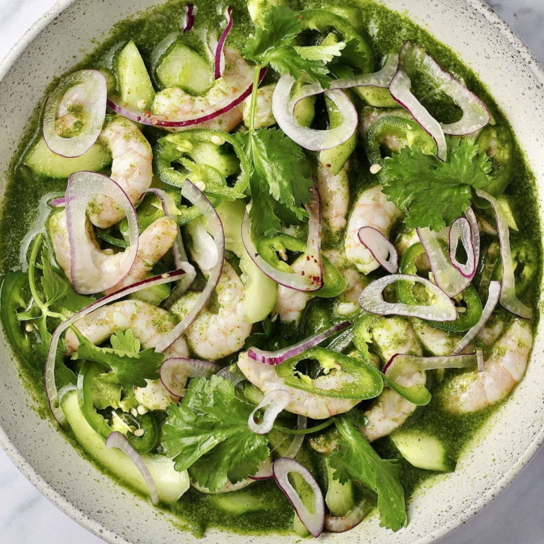 Camarones crudos grandes curtidos en salsa de serrano. con limón, pepino, cebolla morada y aguacate