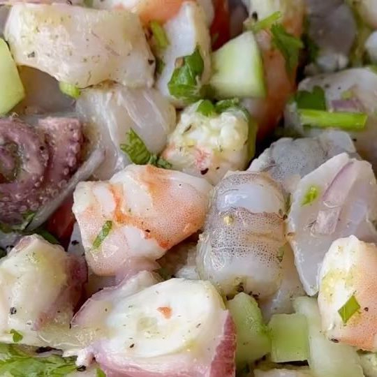 Mucho marisco. Mezcla de pulpo y camarón crudo y cocido bañado con la mezcla especial de la casa.
