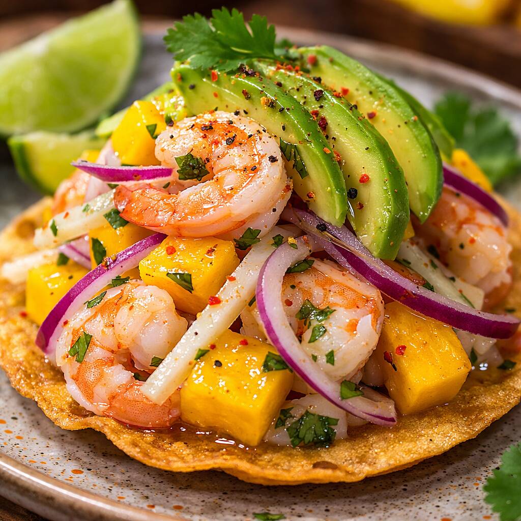 Tostada de ceviche de camaron cocido y pulpo con mango, pepino y cebolla morada. Coronada con aguacate. Salsa de soya, serrano y mayonesa de chipotle