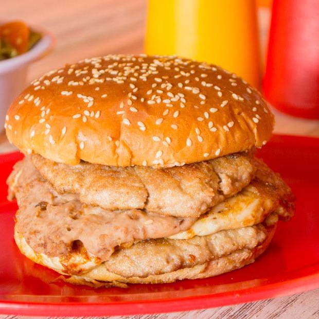 Milanesa de res con queso, acompañada de nuestros exquisitos frijoles refritos, chiles 100% caseros, catsup, mostaza.