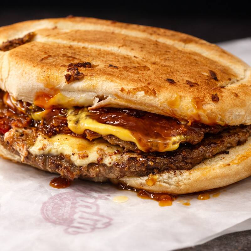 Carne de res con queso amarillo, acompañada de nuestros exquisitos frijoles refritos, chiles 100% caseros, catsup, mostaza.