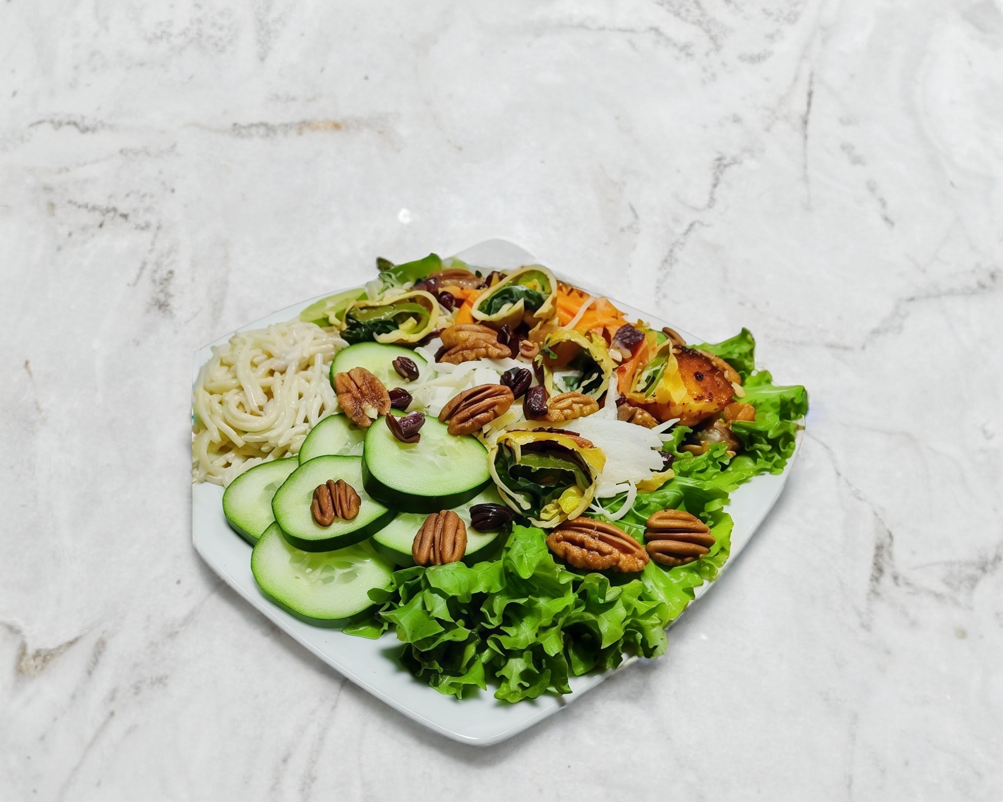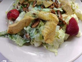 Lechuga, pepino, manzana, salsa de yogur con mostaza, nuez, arándanos y pollo asado.