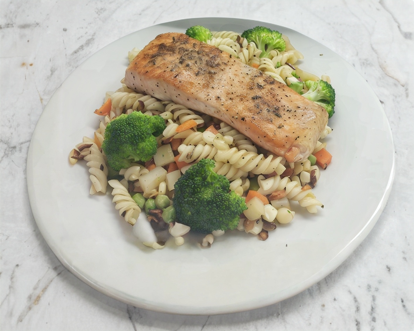 Ensalada de pasta y salmón, pasta de rutini, verduras al vapor, escalope de salmón de 210 g y salsa de ajo .