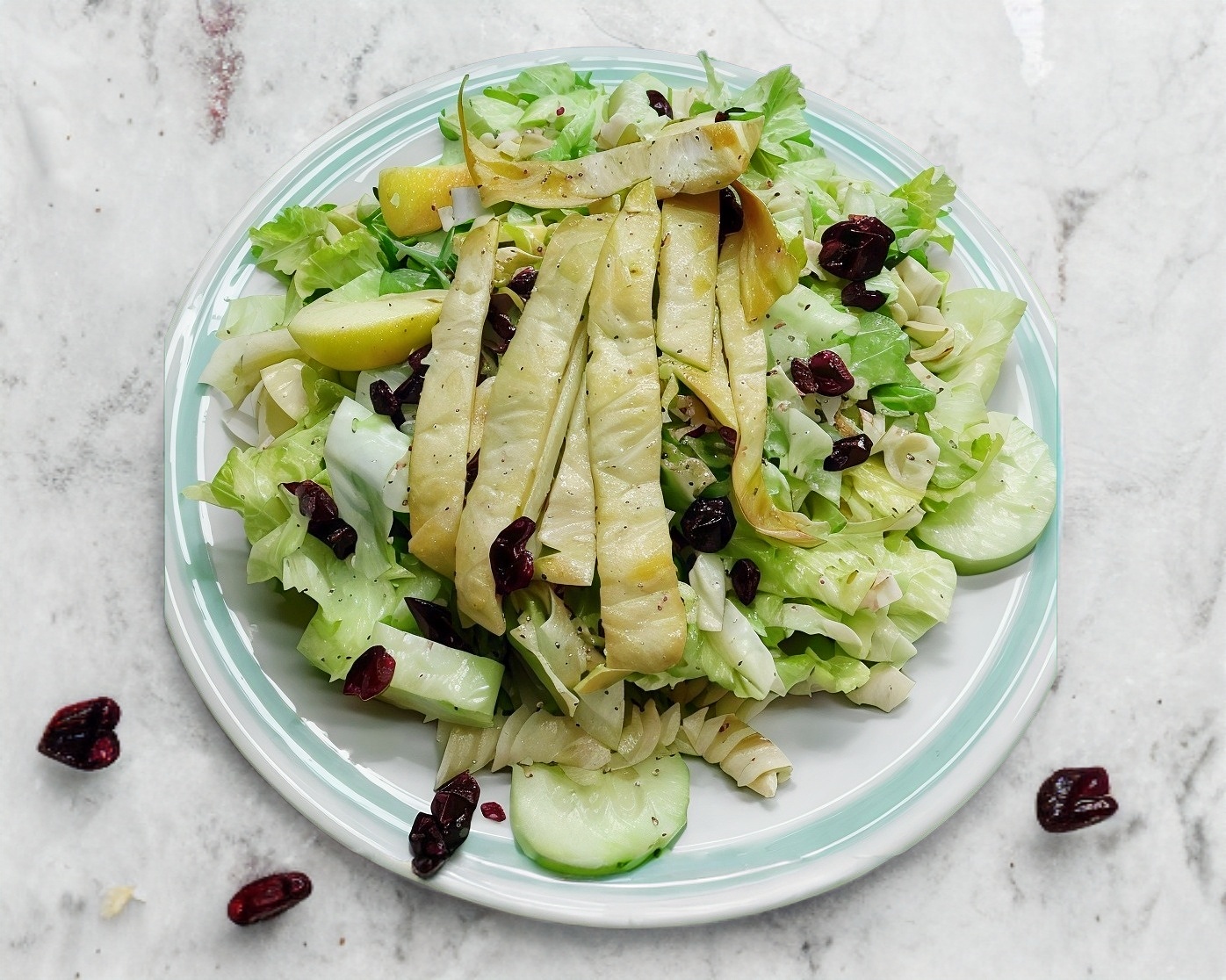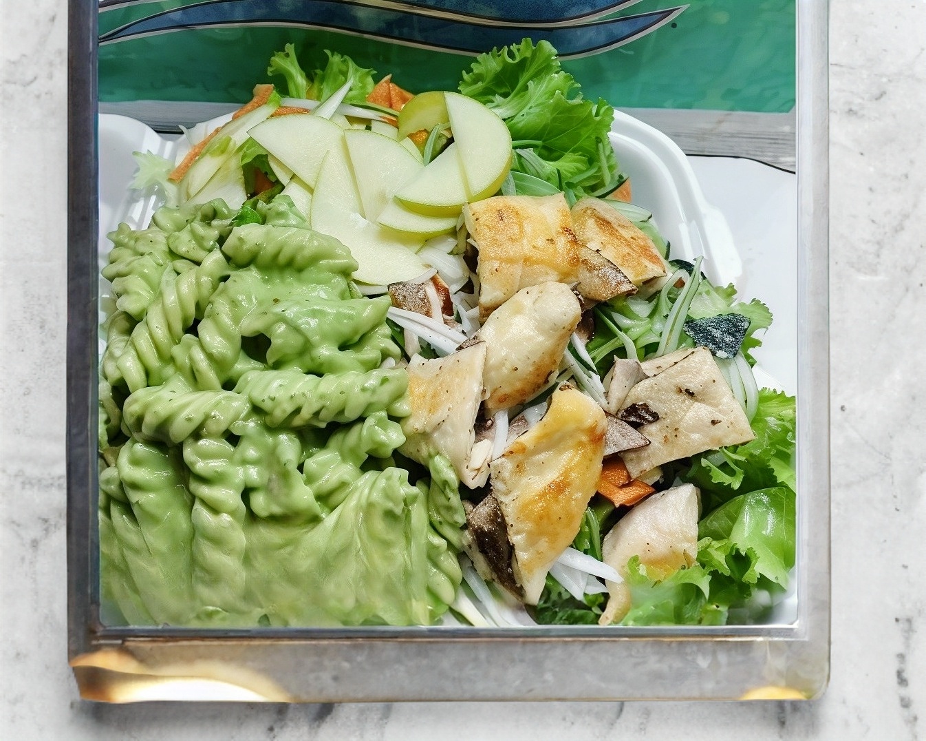 Lechuga, pepino, manzana, pasta Rutini, salsa de yogur con mostaza, ajonjolí, arándanos, nuez y pollo asado.