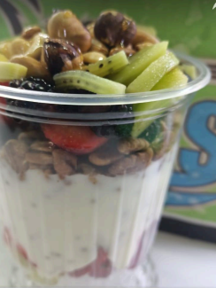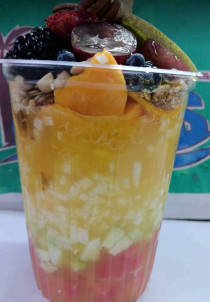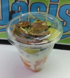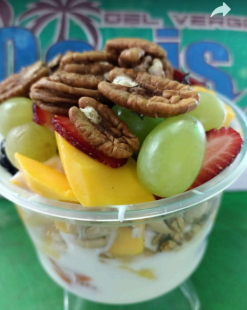 Escamocha grande de 24 oz, fruta de temporada, yogurt natural, granola, nuez, arándanos y nuez de la india,