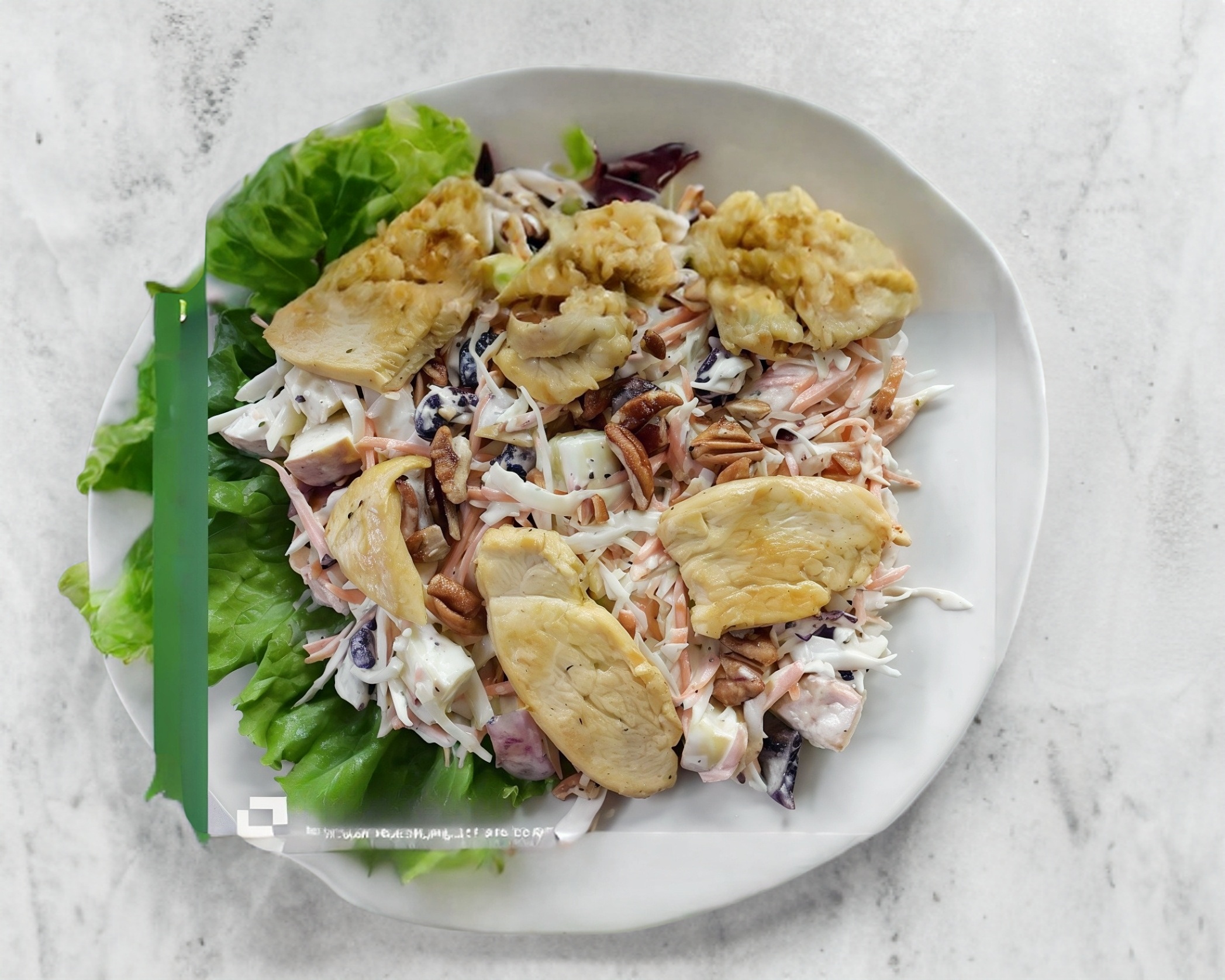 Col, zanahoria, manzana, salsa de yogur con mostaza madre, arándanos, nuez y cubitos de pollo asado.