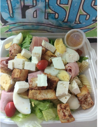 Lechuga, pasta Rutini, huevo cocido, cheris, morrón, jamón, panela aceitunas y crotones .