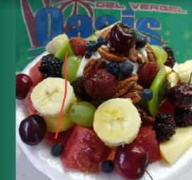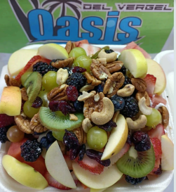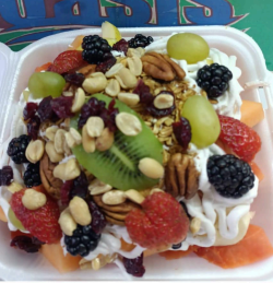 Fruta de temporada, chantilly, cacahuate, nuez , arándanos, nuez de la india y miel .