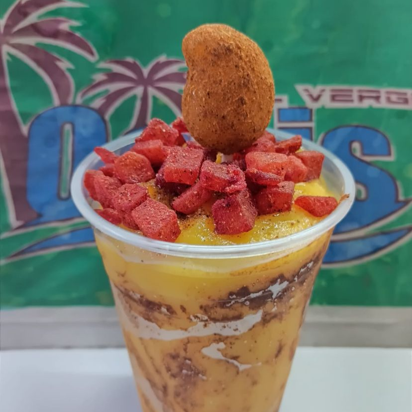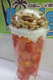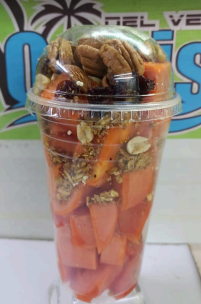 Papaya, chantilly, granola, cacahuate, nuez, nuez de la india y miel.