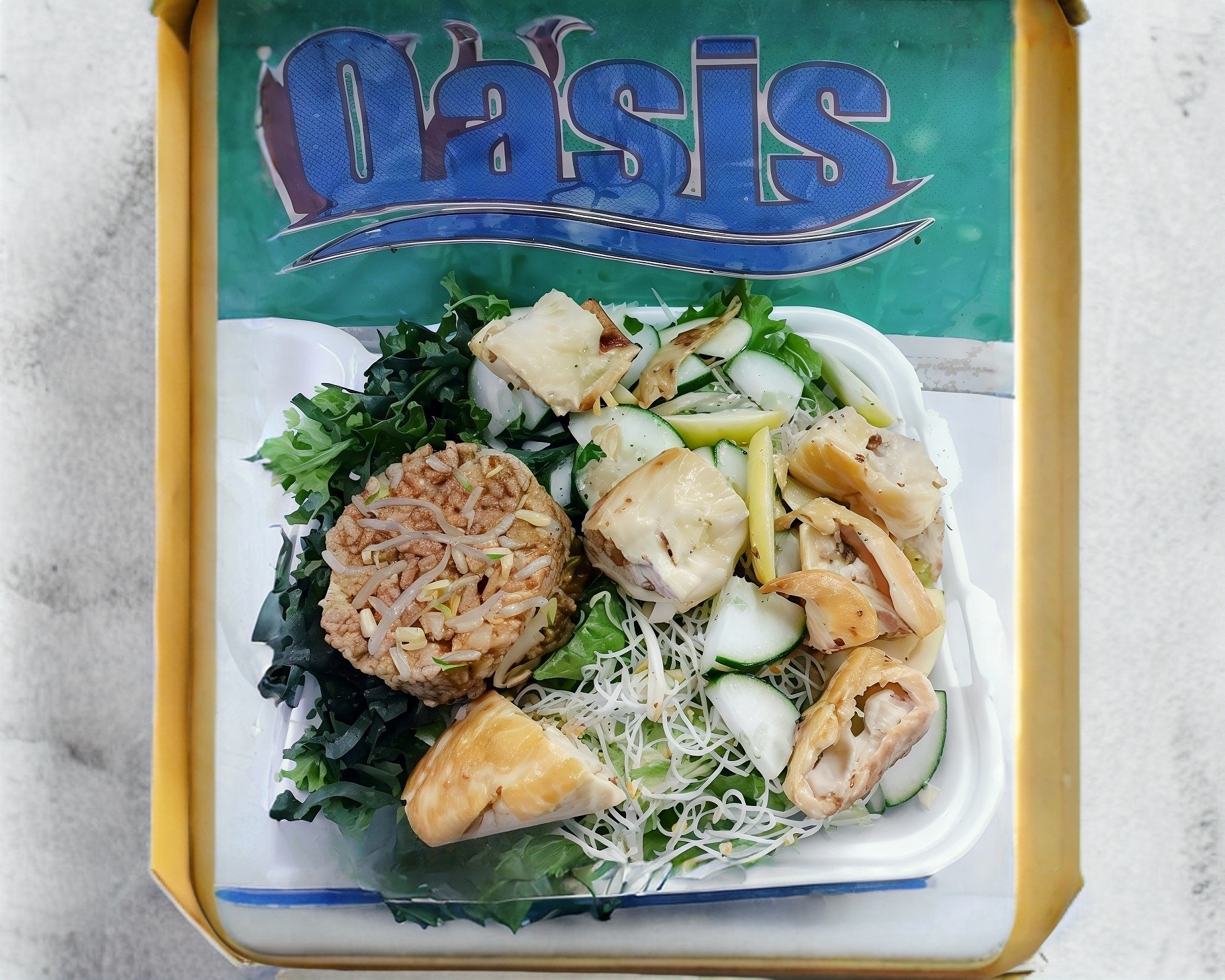 Con arroz salvaje, lechuga, germen de alfalfa, manzana, pepino, andamos, nuez, pechuga rellena de zetas con champiñones y aderezo.