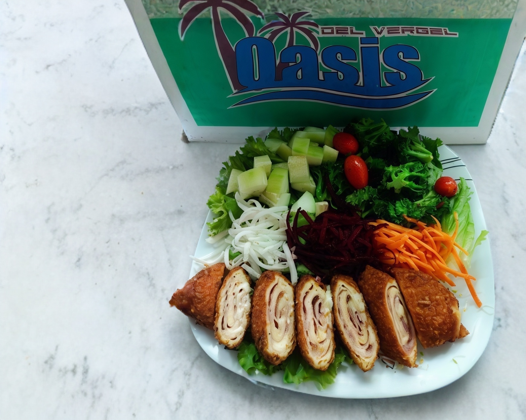 Lechuga, cherrys, pepino, zanahoria, jícama , betabel, pechuga de pollo relleno de Queso manchego y jamón empanizado.
