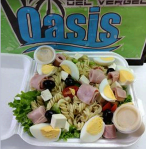 Lechuga, pasta, cheris, pimiento morrón, cebolla, aceitunas, jamón, queso panela, huevos cocidos, crotones y aderezos. aderezo.