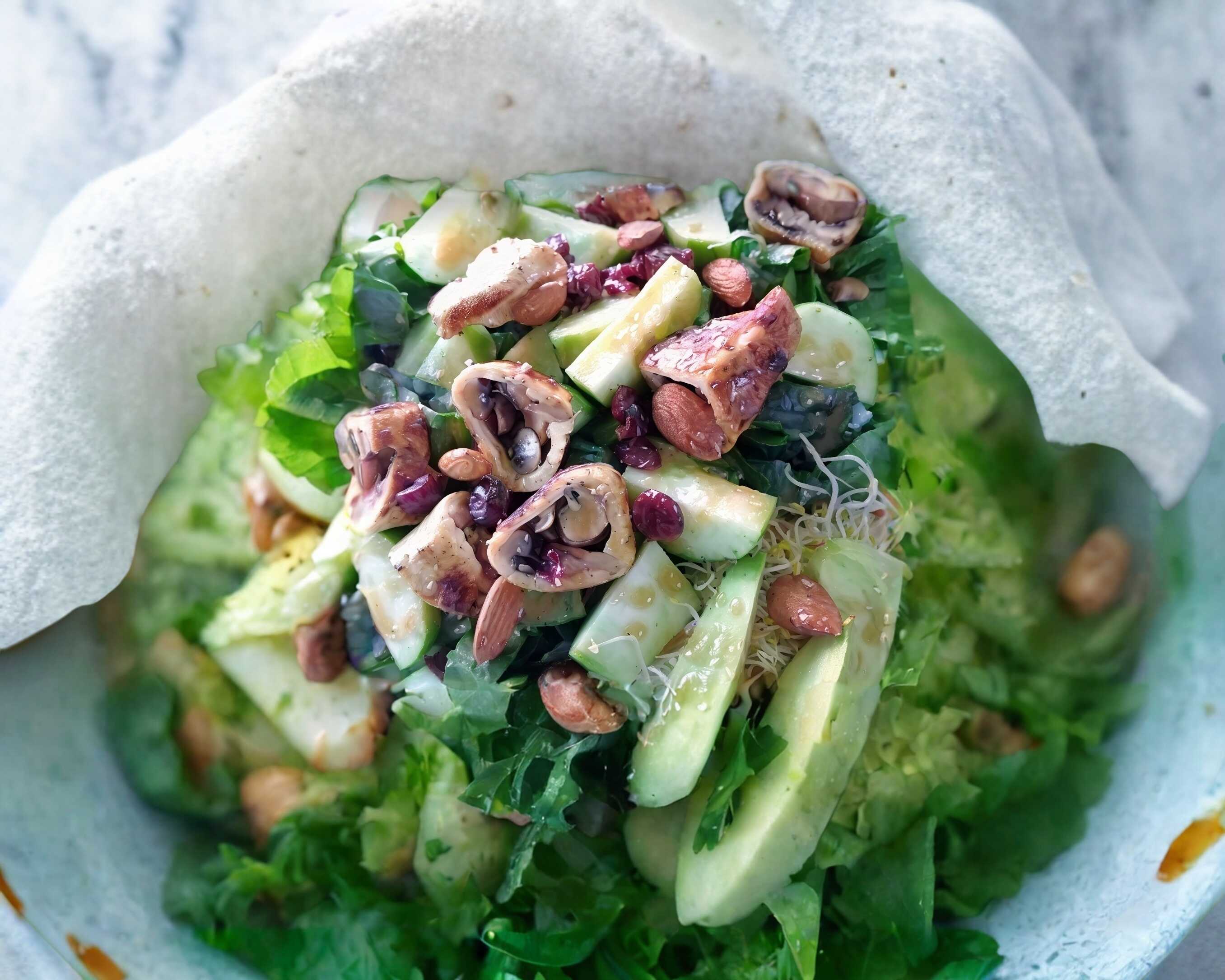 Lechuga, espinacas, manzana, pepino, almendras, arándanos y pollo relleno de champiñones.