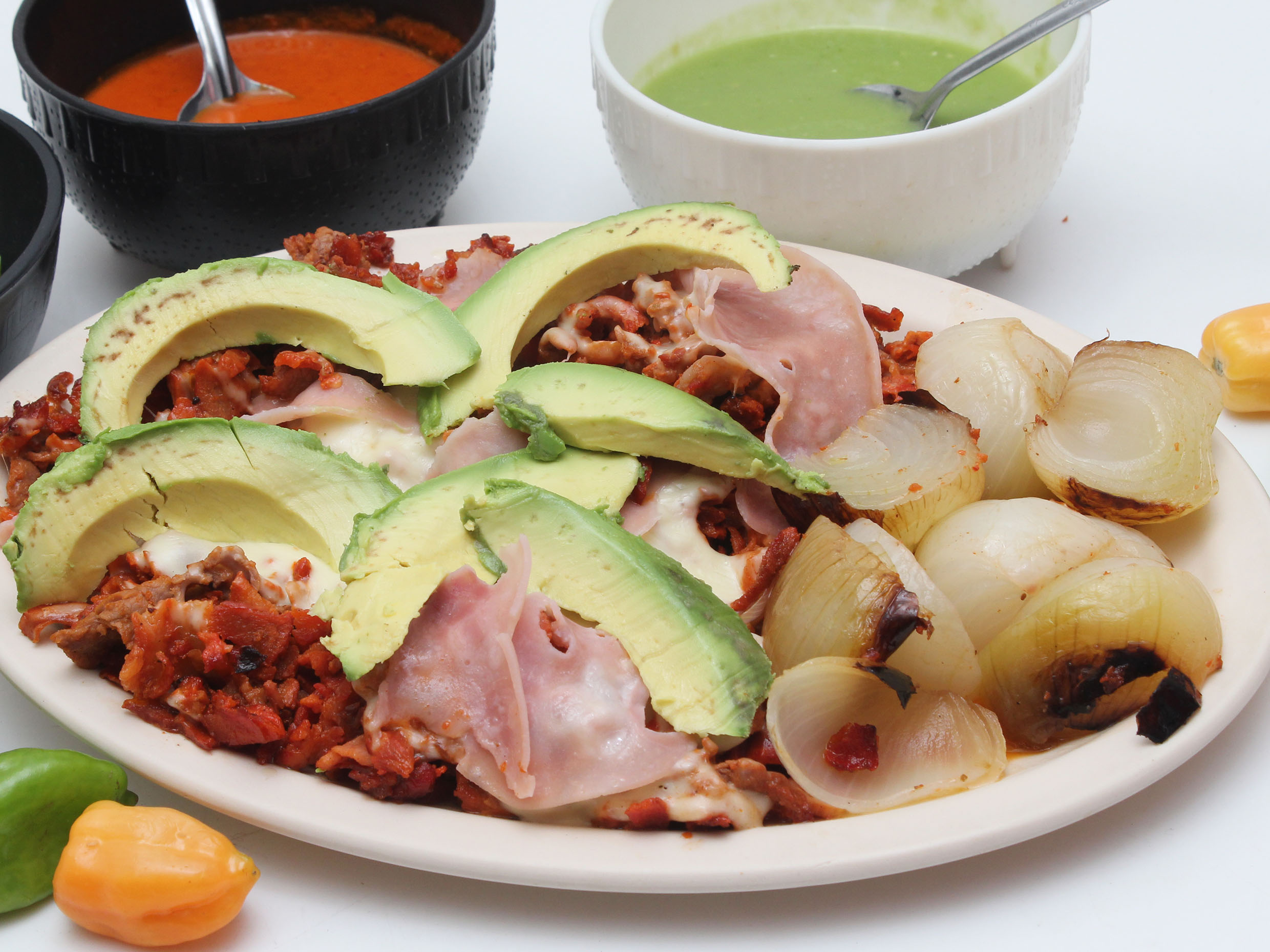 Pastor, bistec, chuleta, tocino, jamón, queso y aguacate. (Tamaño personal).