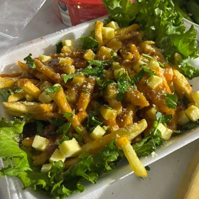 Papas a la fransesa con variedad de quesos en cubos, queso amarillo, Gouda y parmesano, una base de gravy sabor res con un toque de perejil al centro.