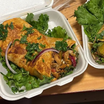 Delicioso Shawarma de pollo sazonado con diversas especies, acompañado de una base de lechuga, jitomate azado en cubos, cebolla morada, pepinillos, una base de salsa de ajo con yogurt, y picante al gusto.