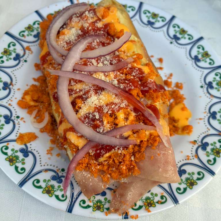 Deliciosos hot dogs cubiertos con queso y una capa de cheetos flaming hot/queso, con chiles y cebolla cocida sazonada