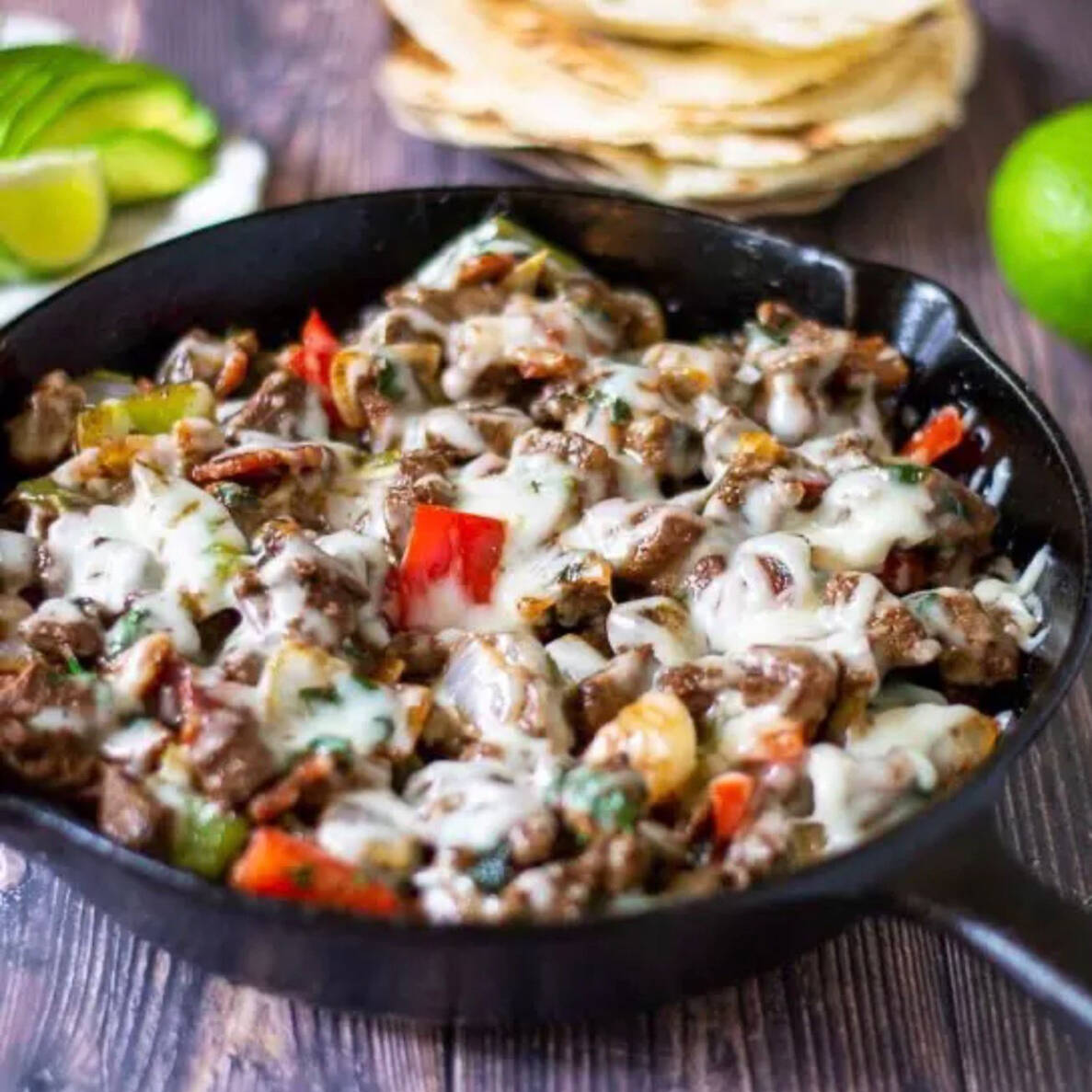 Jugosa combinación de tiras de bistec tierno mezcladas con queso fundido, creando un sabor intenso y cremoso.
