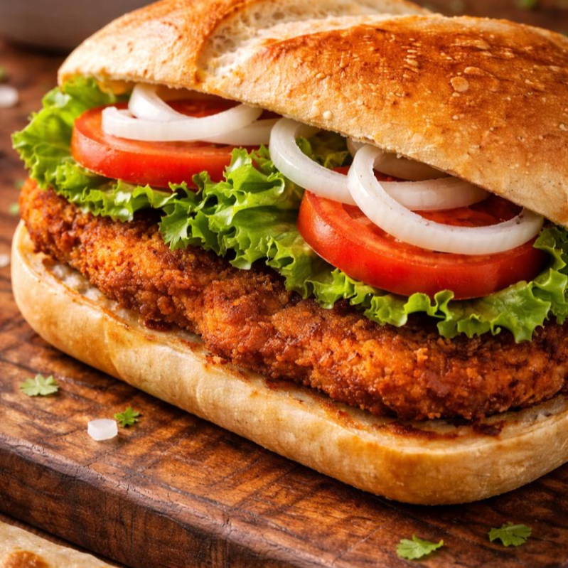 Deliciosa torta de milanesa preparada en bolillo convencional con lechuga, cebolla y jitomate