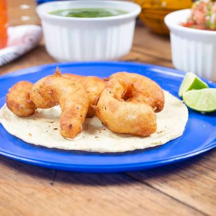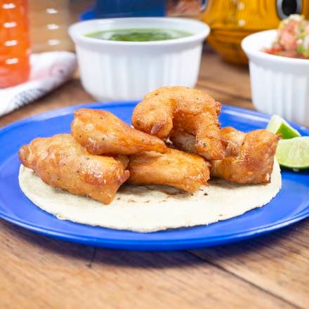 Taco de tortilla de maíz con 45 gr. de camarón capeado, con aderezo de la casa a base de especias