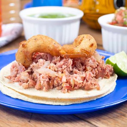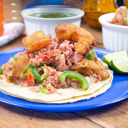 Taco de tortilla de maíz con atún ahumado estilo marlin y camarón capeado (110 gr.), con aderezo de la casa a base de especias
