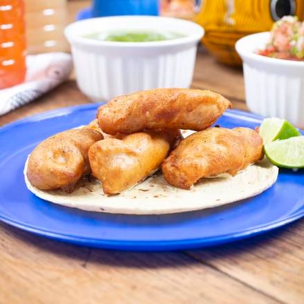 Taco de tortilla de maíz con filete de cazón capeado en tiras (55 gr.), con aderezo de la casa a base de especias