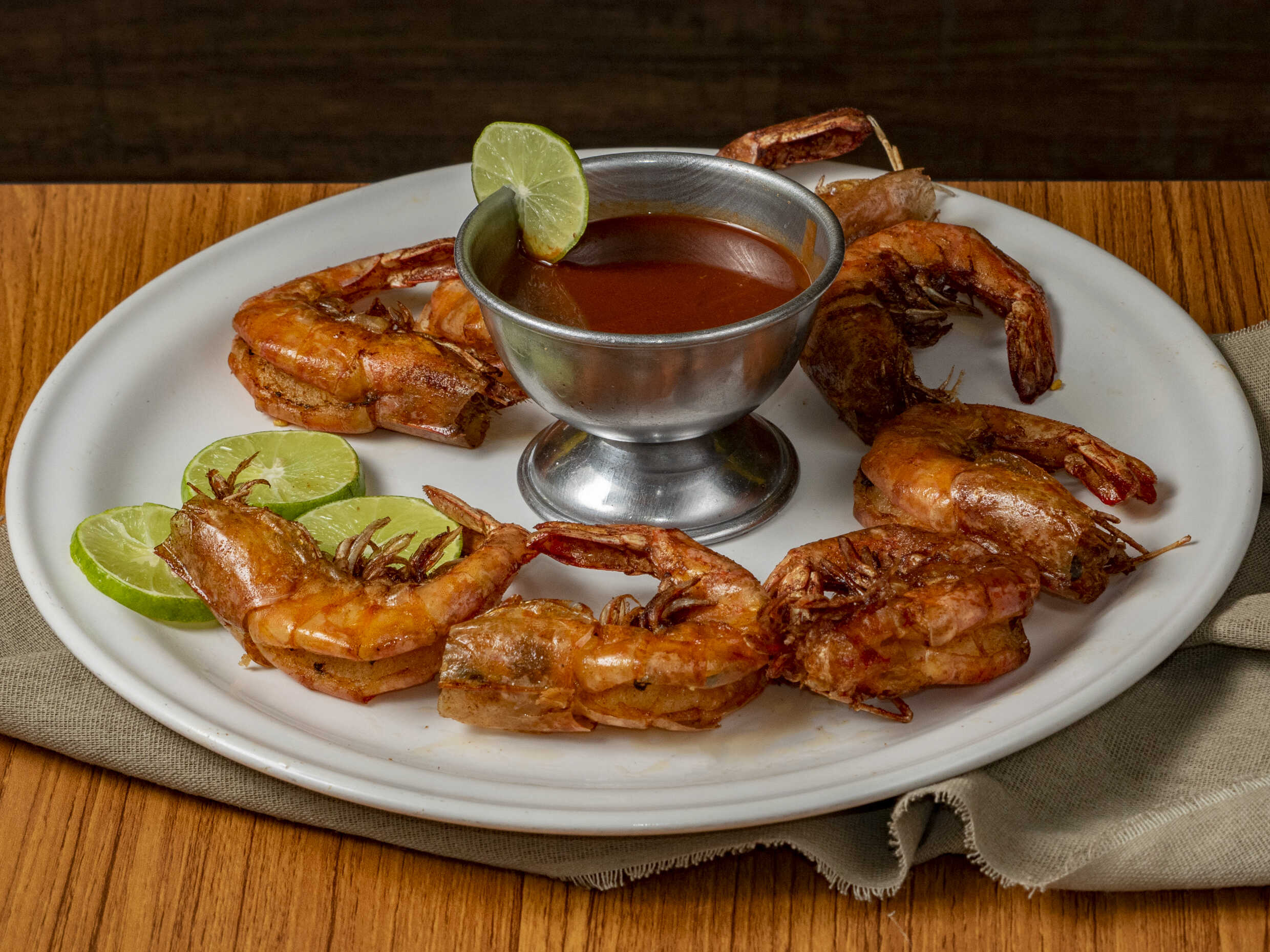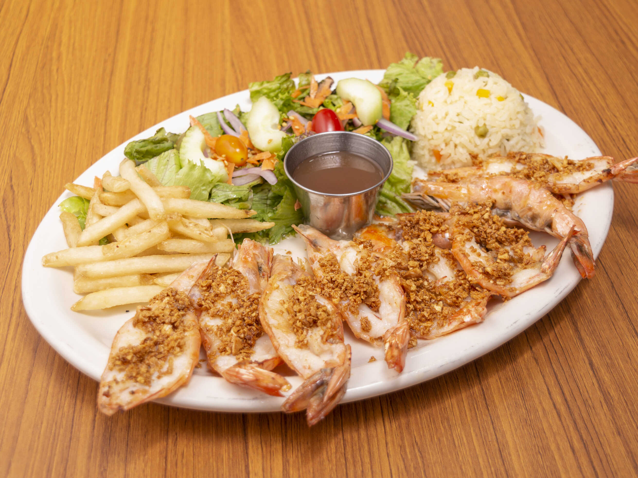 250 Grs. Camarones al carbón abiertos bañados con cebolla a la mantequilla.