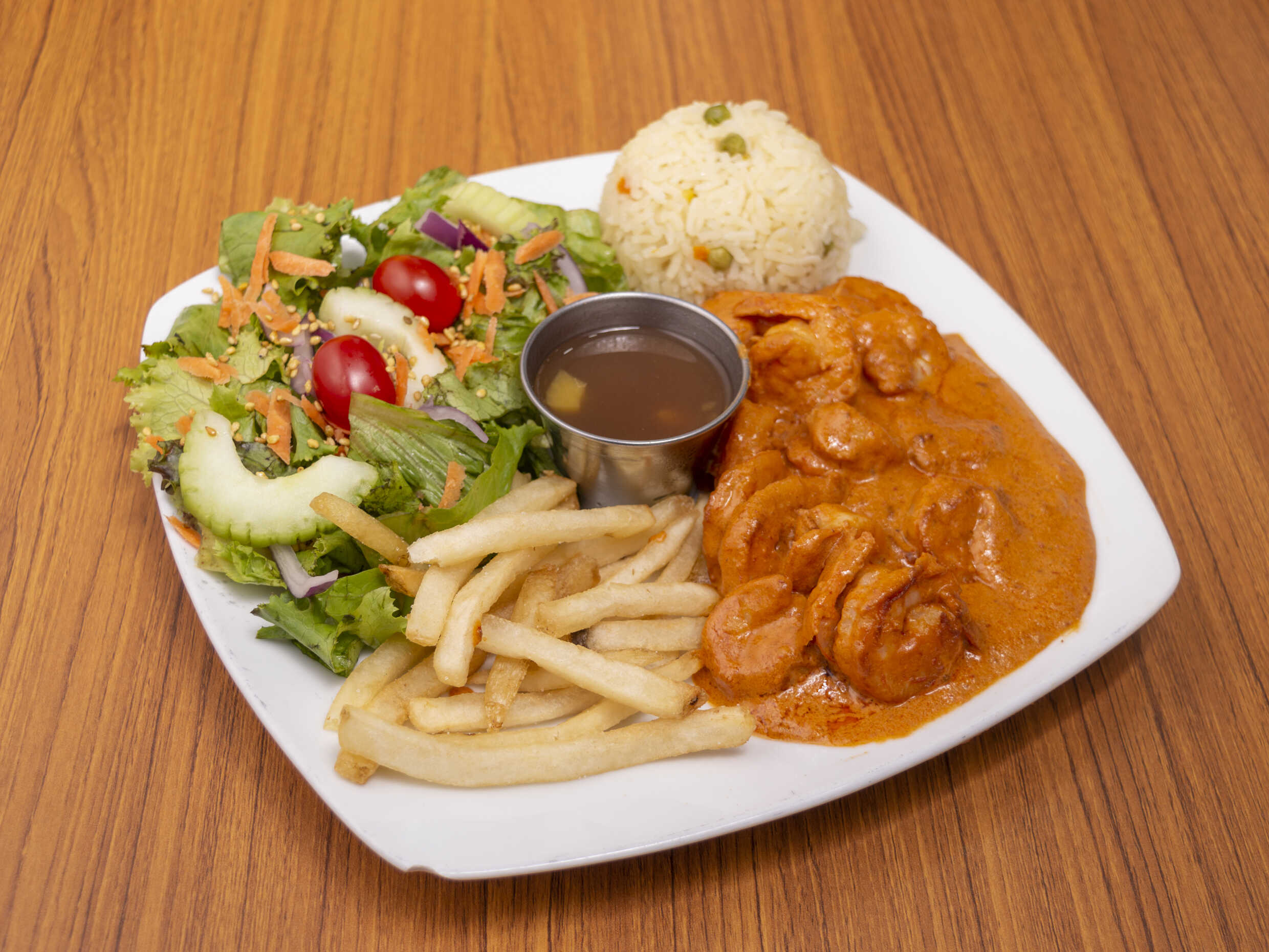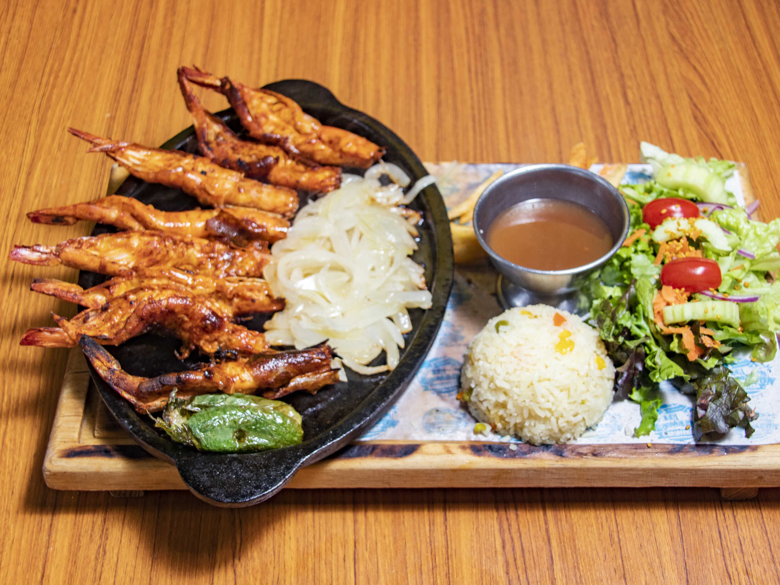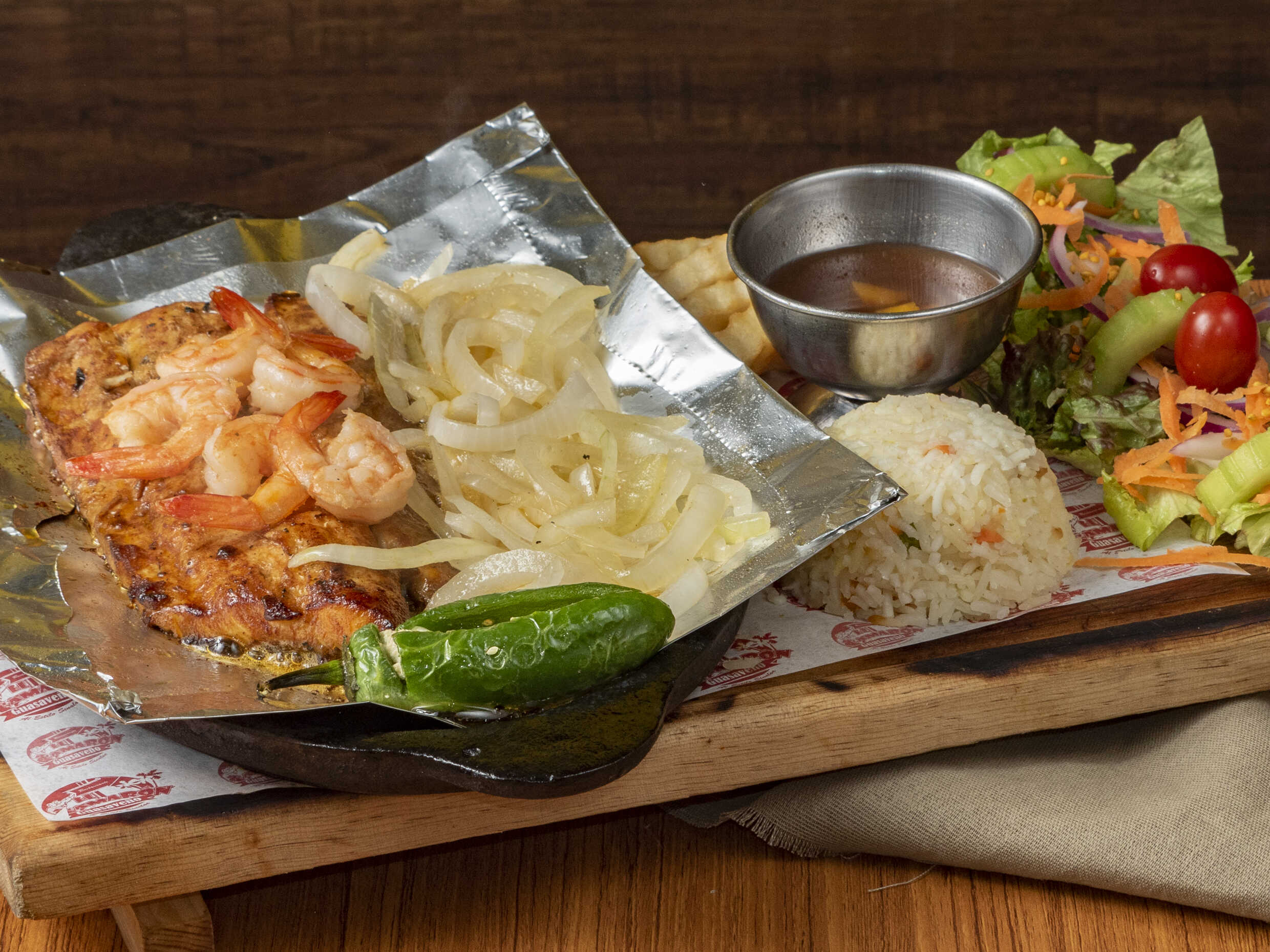 Mix de pimientos, cebolla, camarón natural, arrachera acompañado de arroz y aderezo ranch.