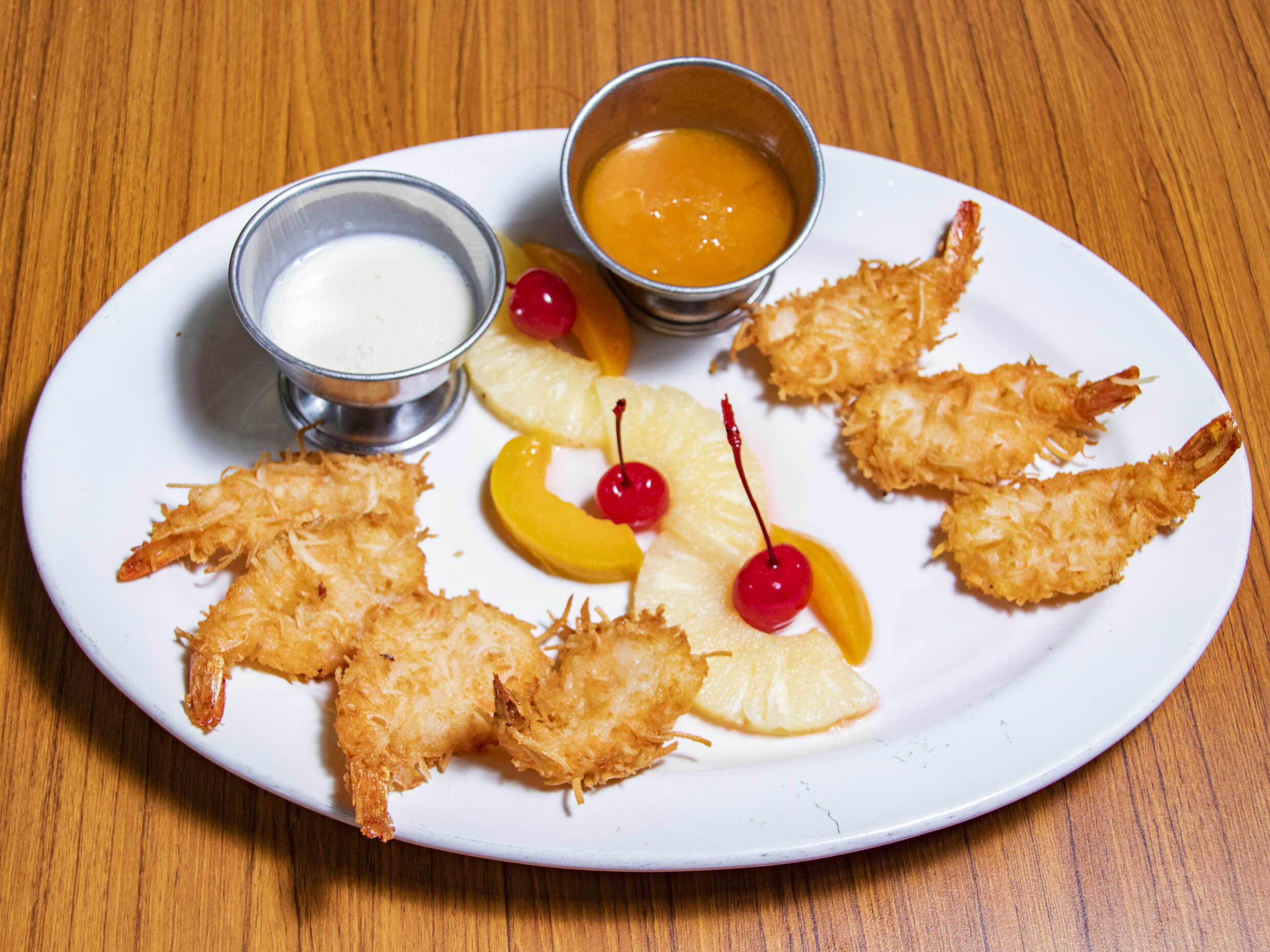180 Grs. Camarones empanizados con coco rallado, acompañados con crema de coco.