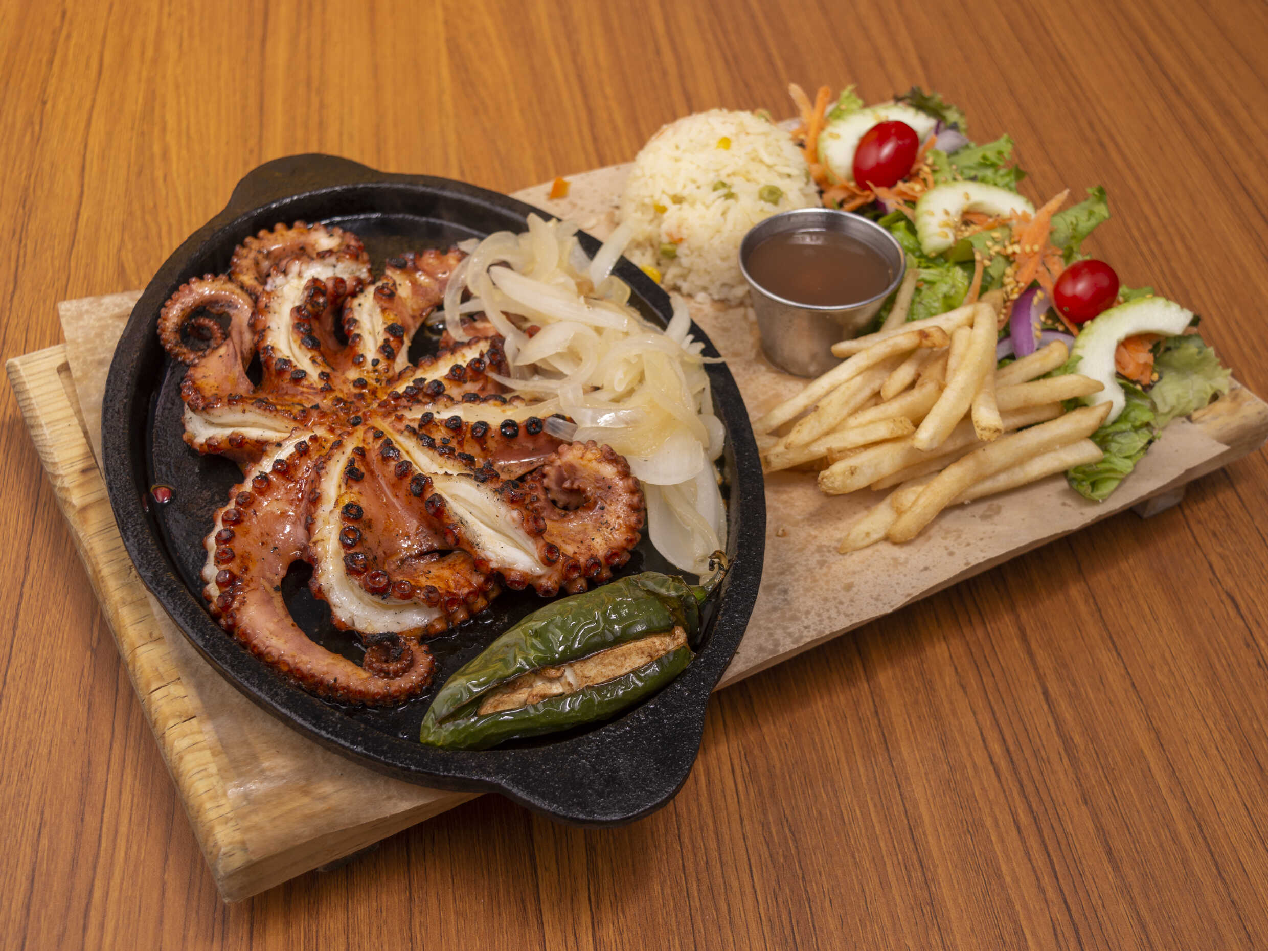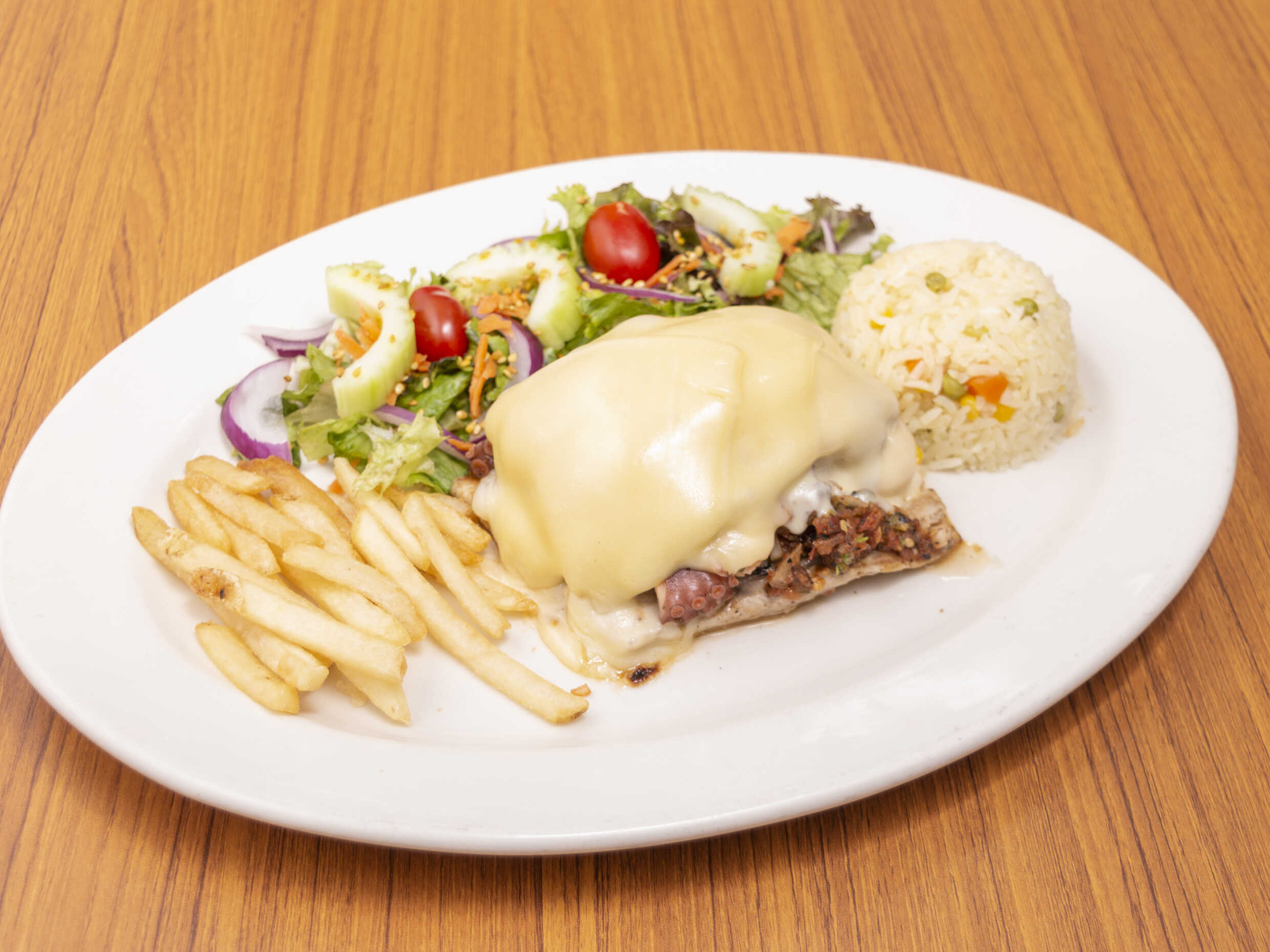 260 Grs. A la plancha relleno de camarón y pulpo gratinado.