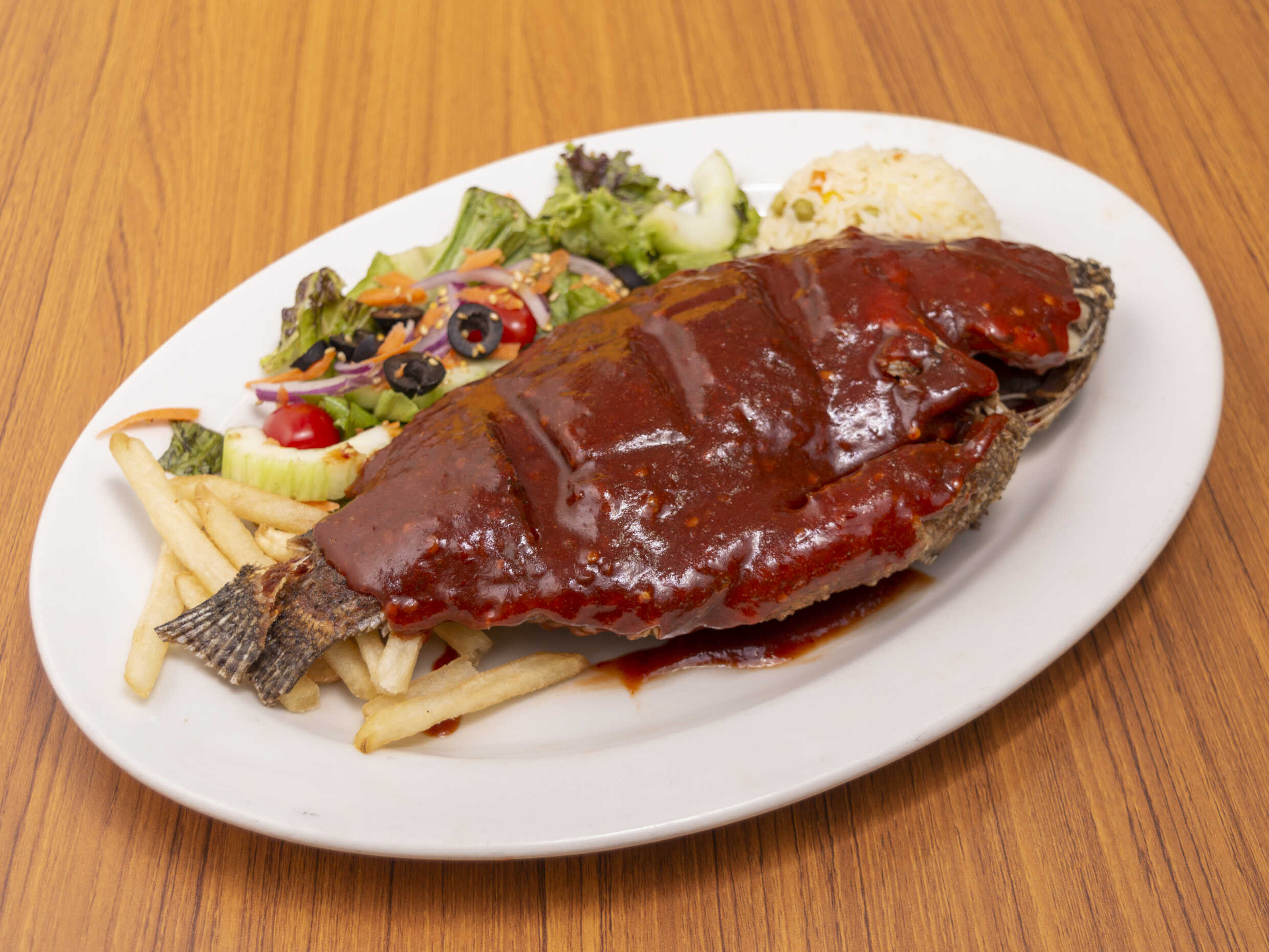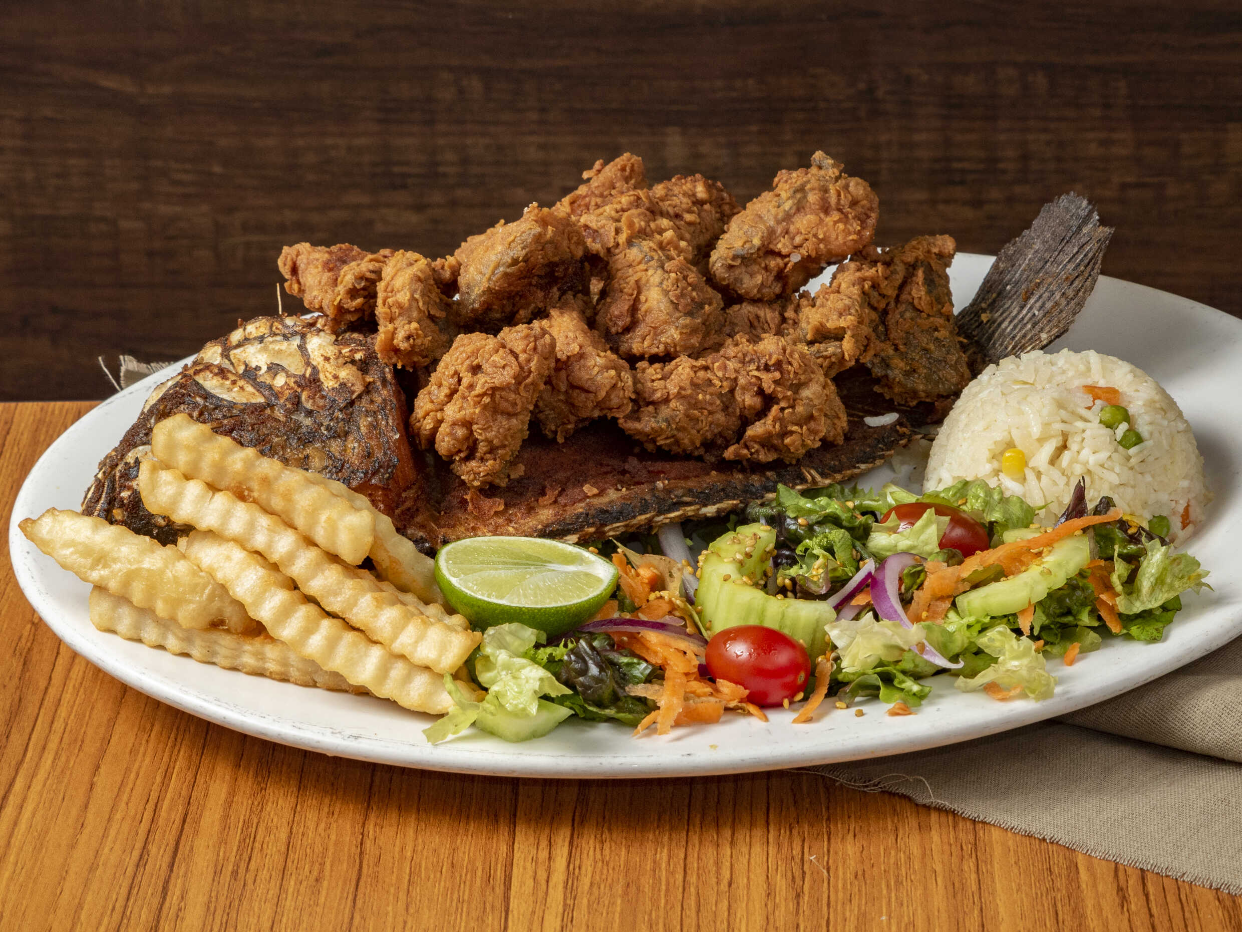 Filetes doraditos, marinados y empanizados, acompañados de espinazo.