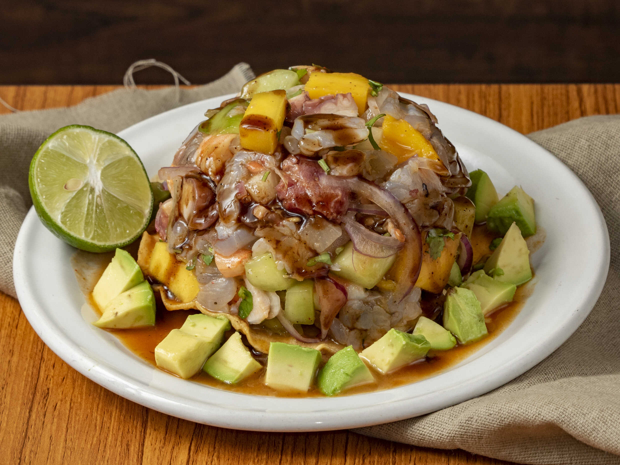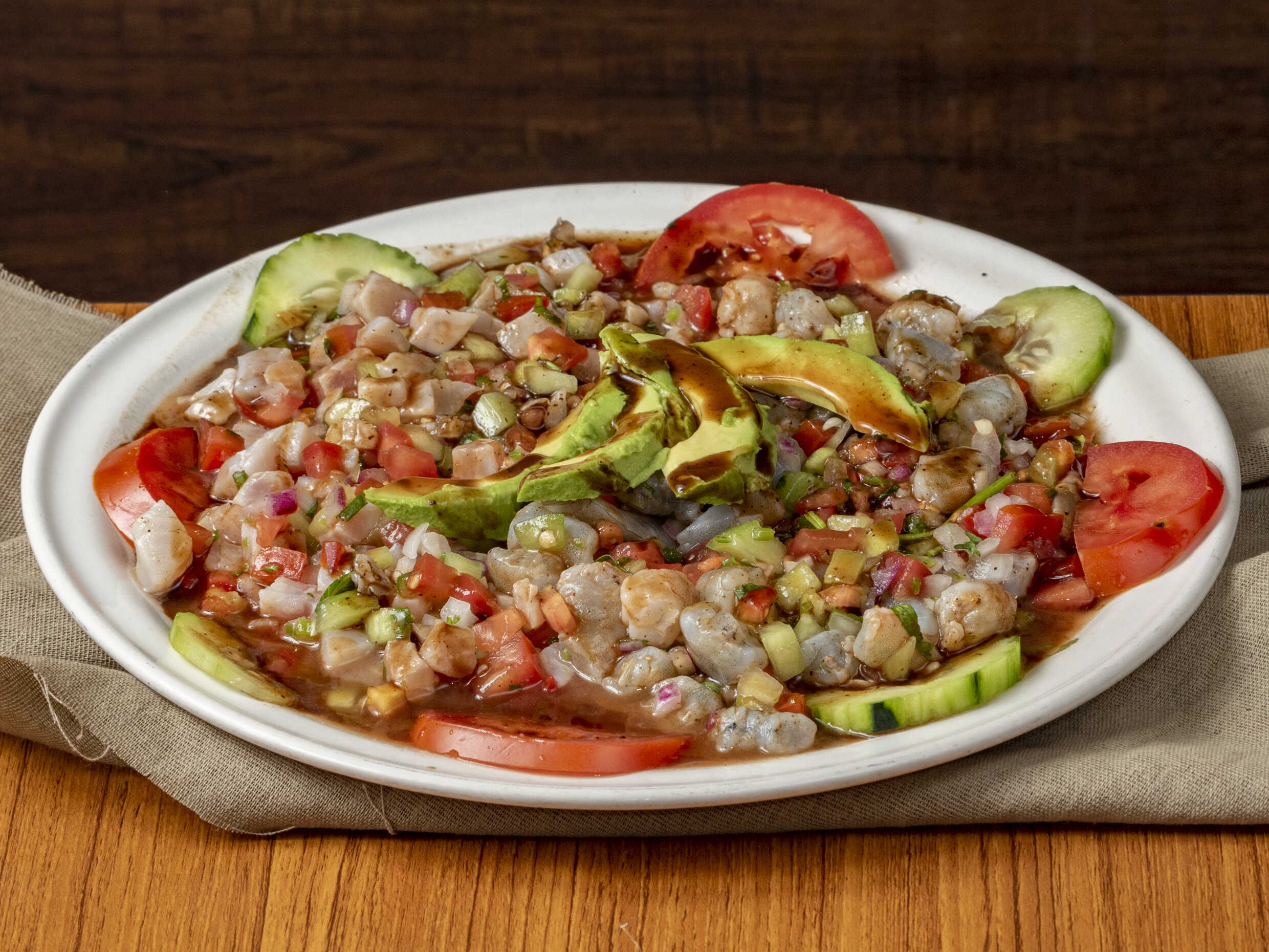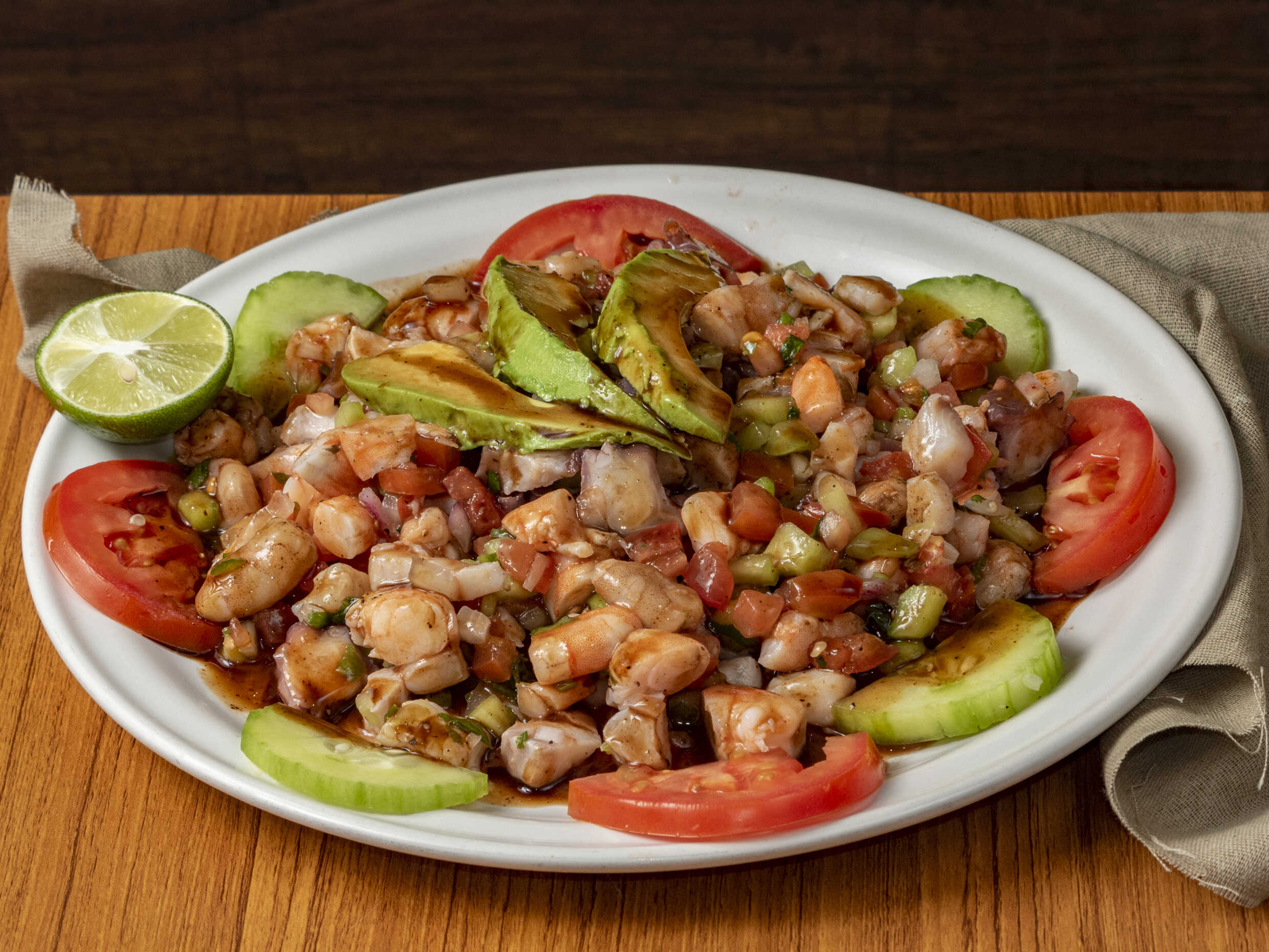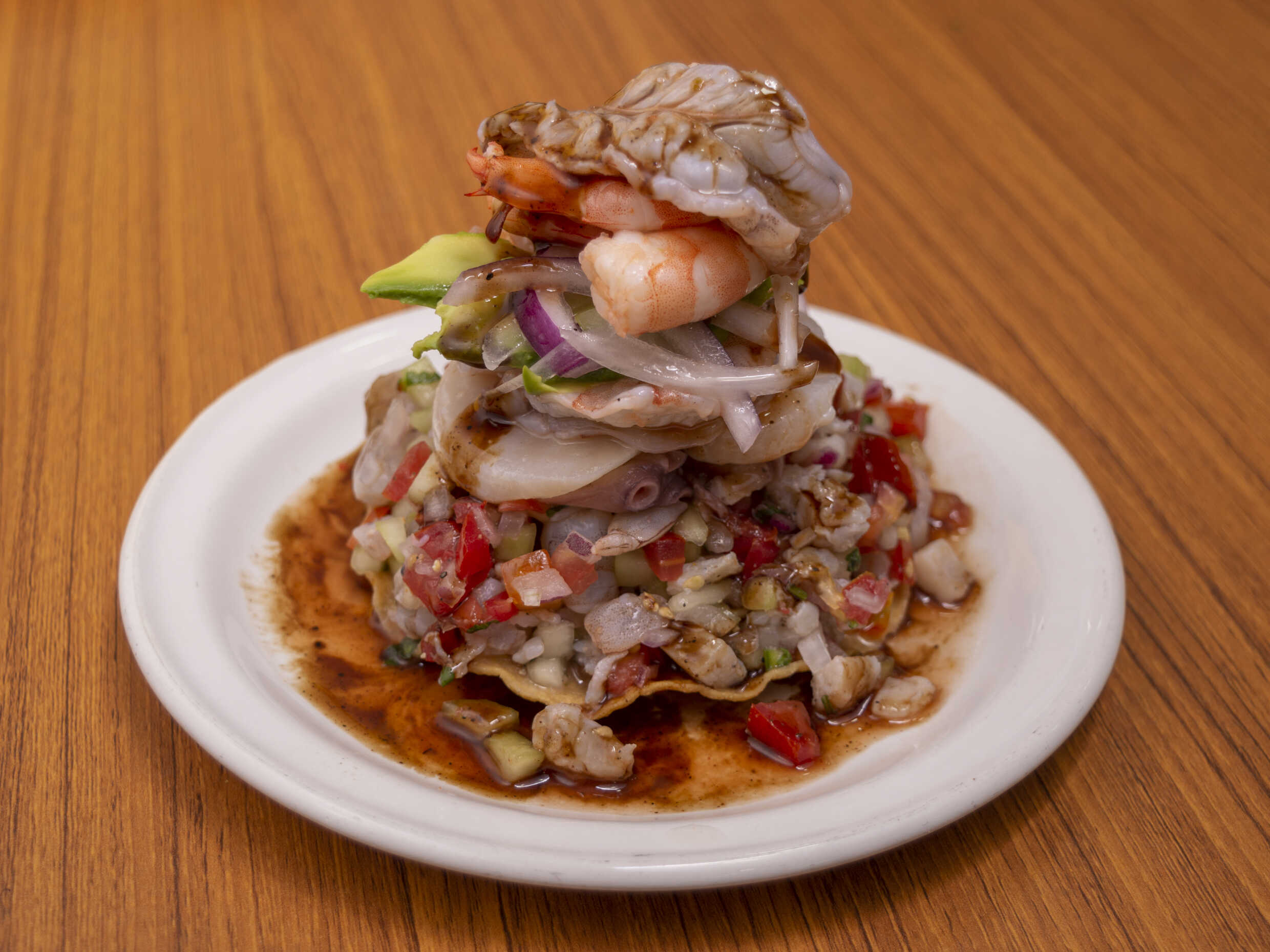 Ceviche de camarón, ceviche de pescado, pulpo y camarón cocido, bañados en salsa negra de la casa.