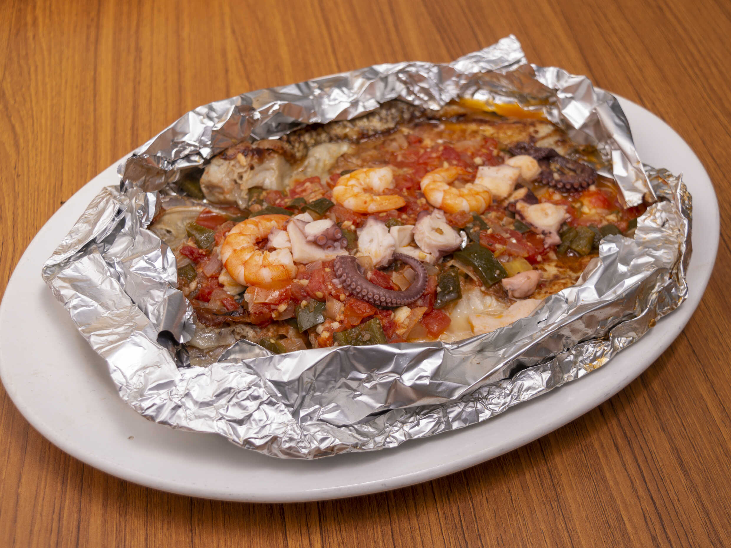 Al vapor, empapelada con camarones, pulpo y verduras.