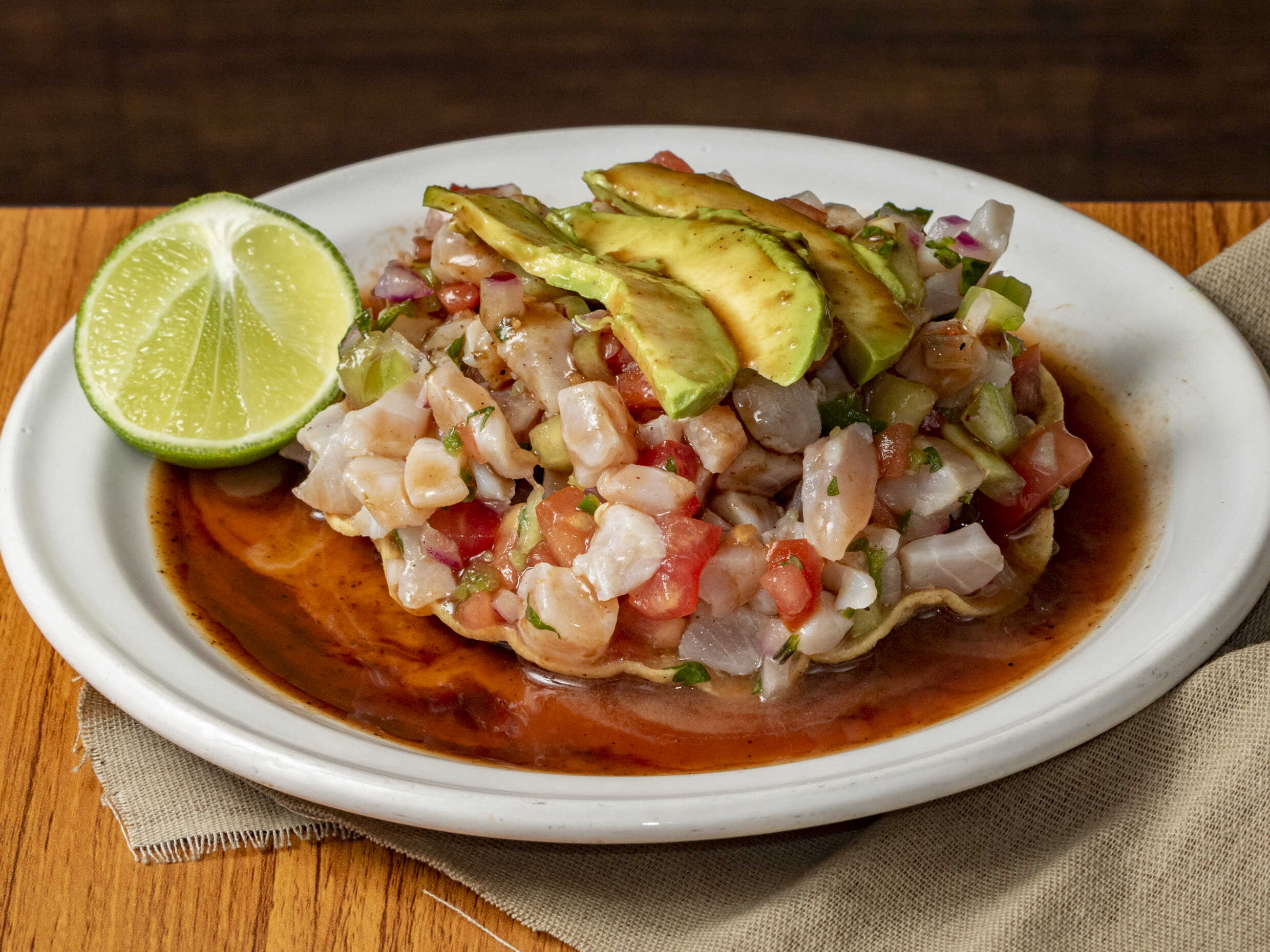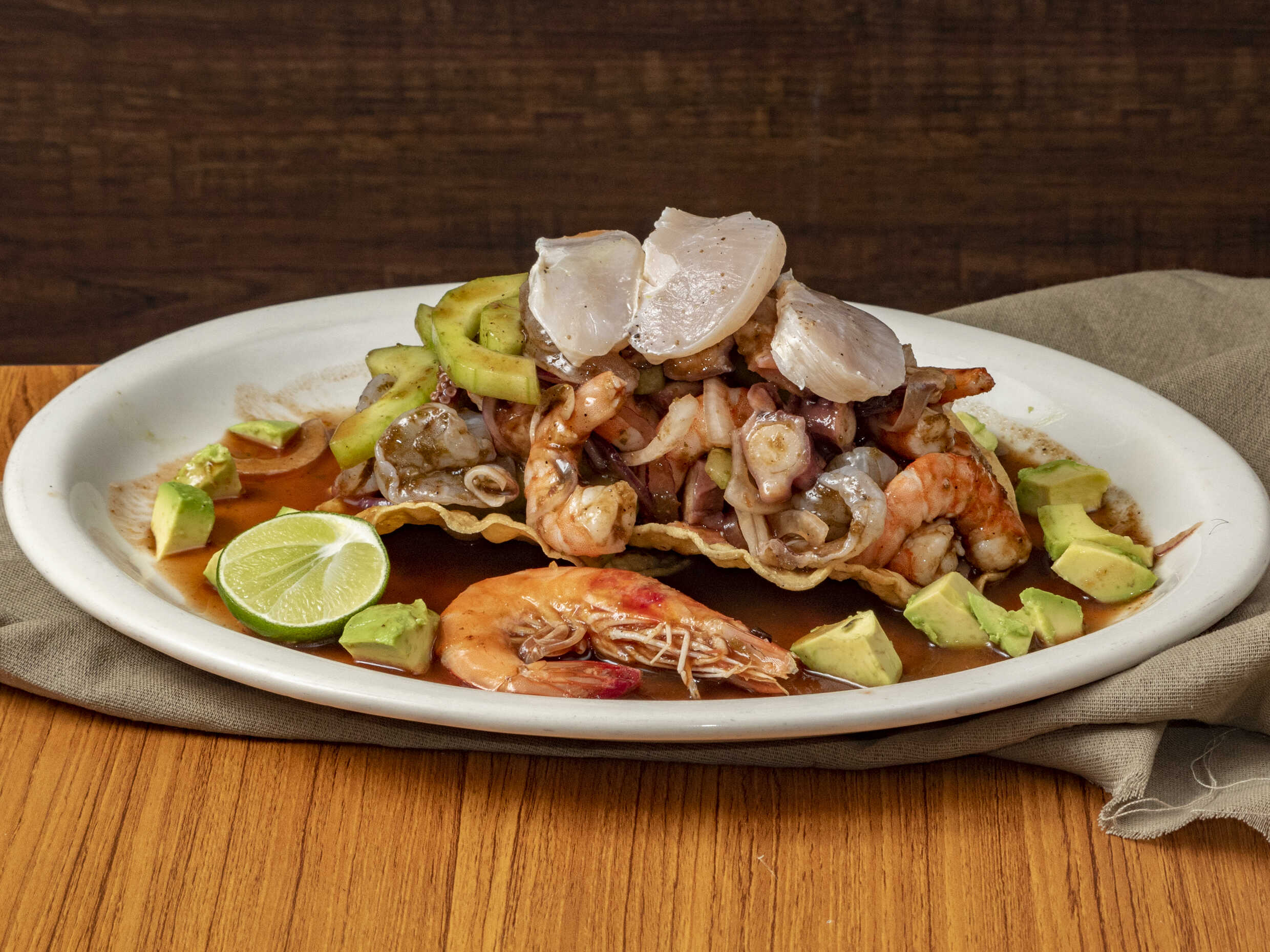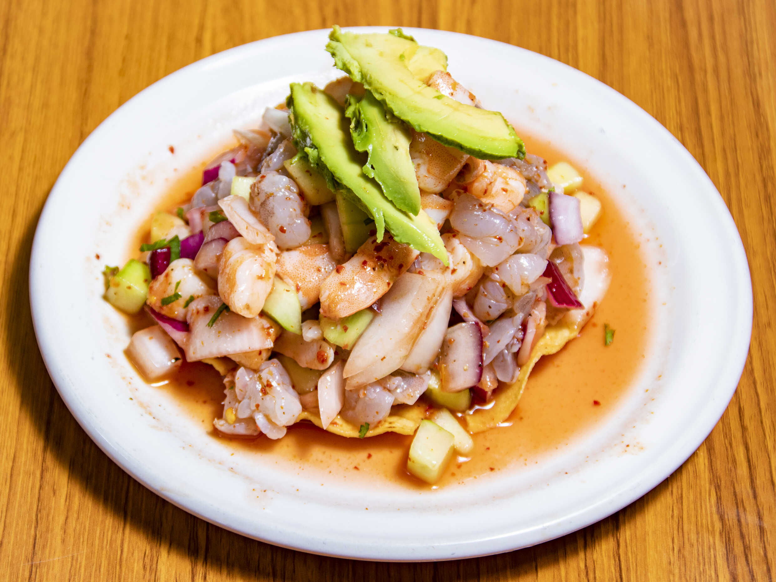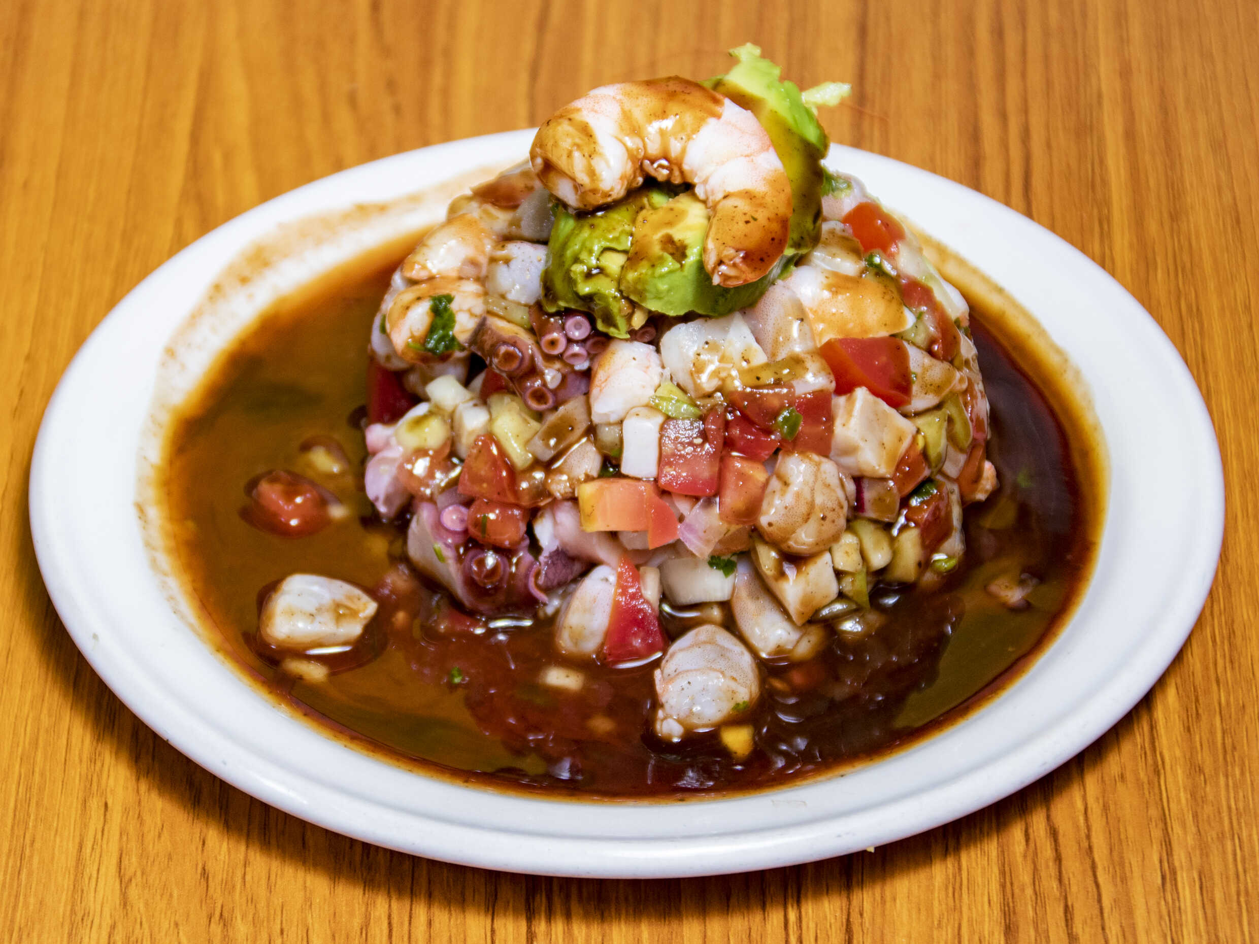 Ceviche de camarón, ceviche de pescado, pulpo, camarón cocido, bañado en salsa mitotera.
