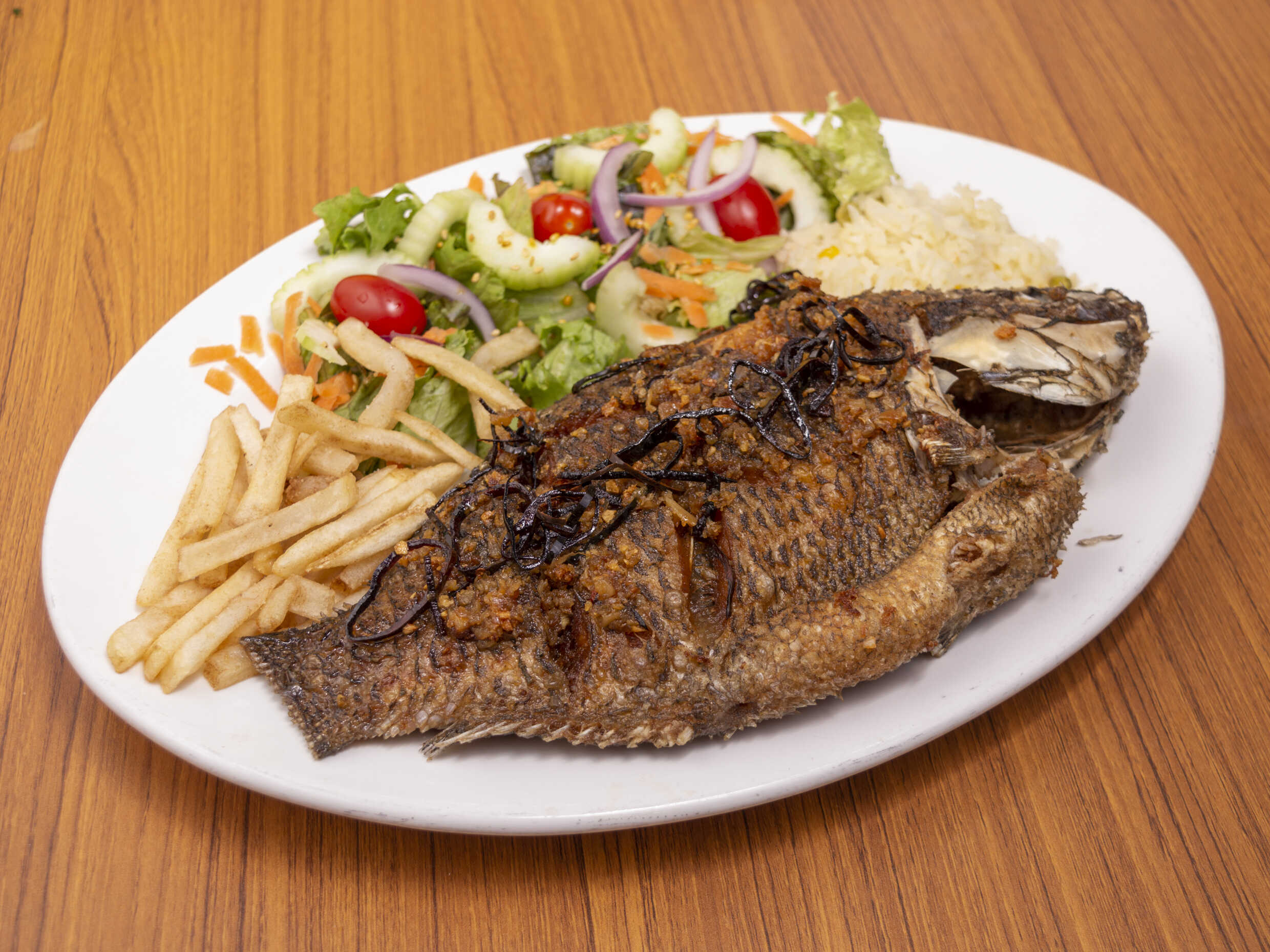 280 Grs. Doradito en brazas, bañado en tradicional mojo de ajo.
