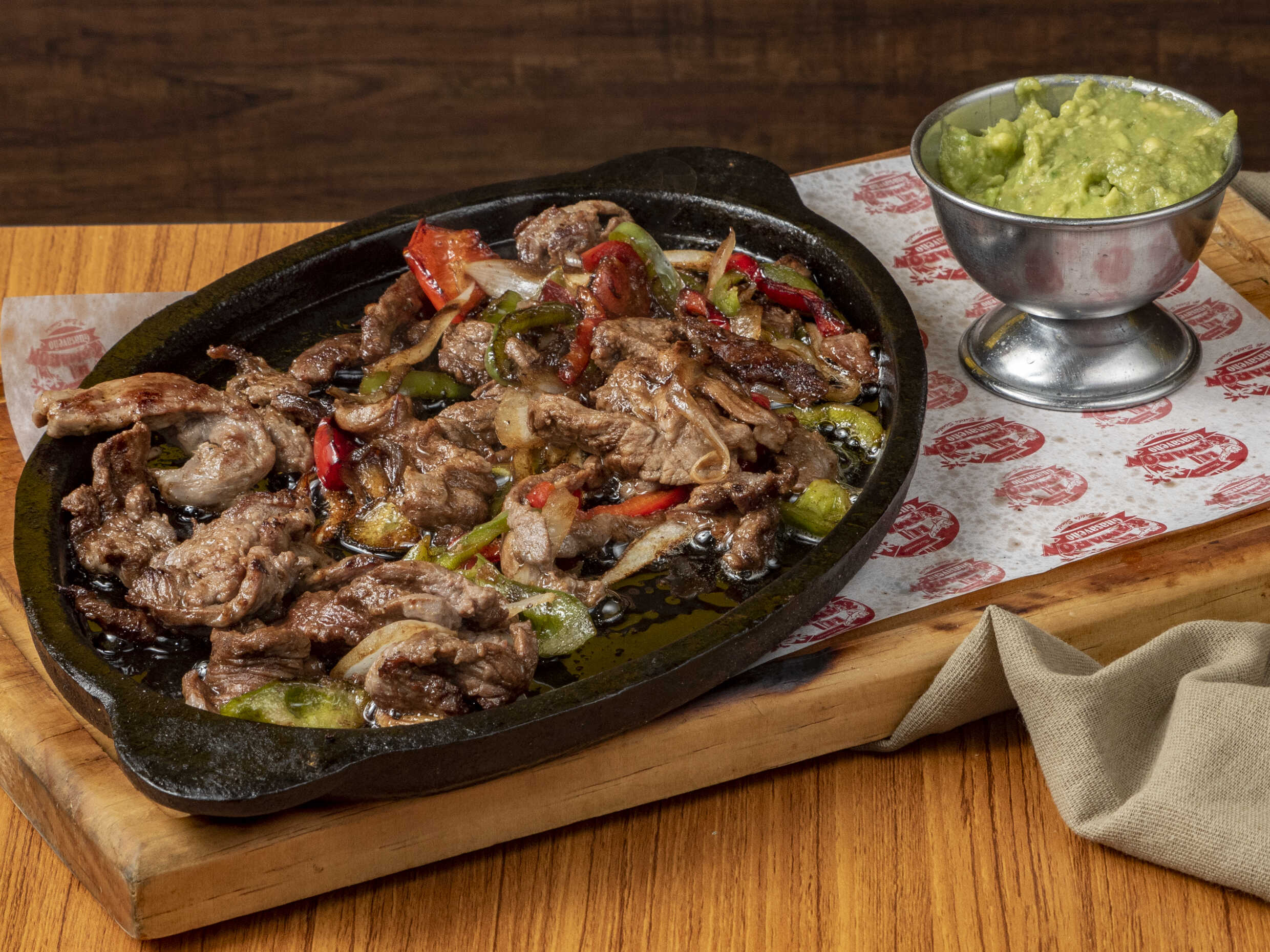 Arrachera con queso manchego, montado sobre tortilla de maíz dorado al carbón acompañado de guacamole, chiles y cebolla.